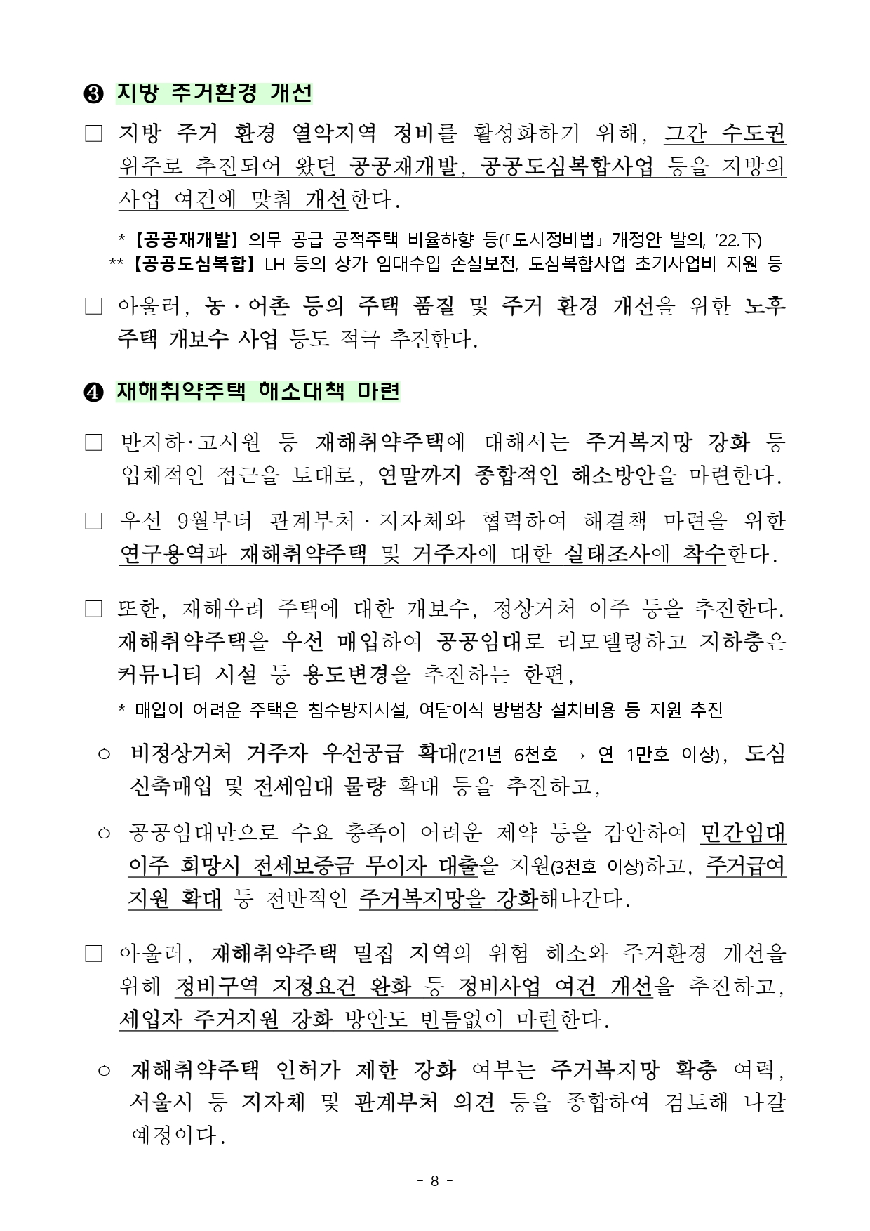 · 재해 대응: 재해취약주택 거주자 주거지원 종합방안 연내 마련