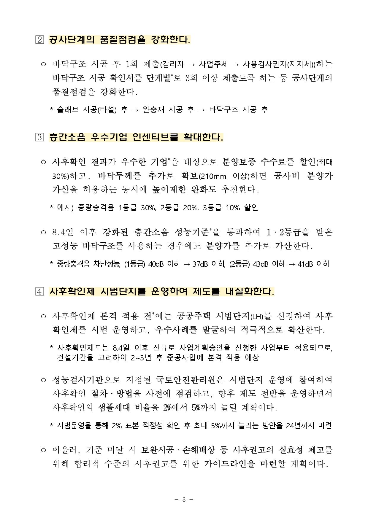 ㅇ사후확인 결과가 우수한 기업*을 대상으로 분양보증 수수료를 할인(최대 30%)하고, 바닥두께를 추가로 확보(210mm 이상)하면 공사비 분양가 가산을 허용하는 동시에 높이제한 완화도 추진한다.
