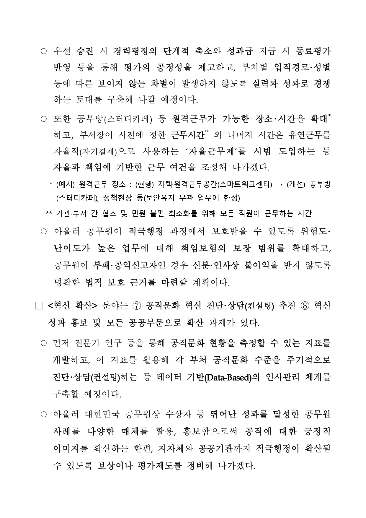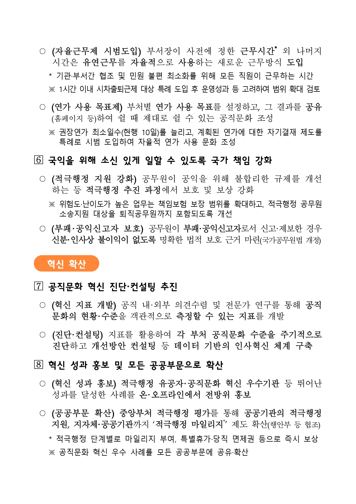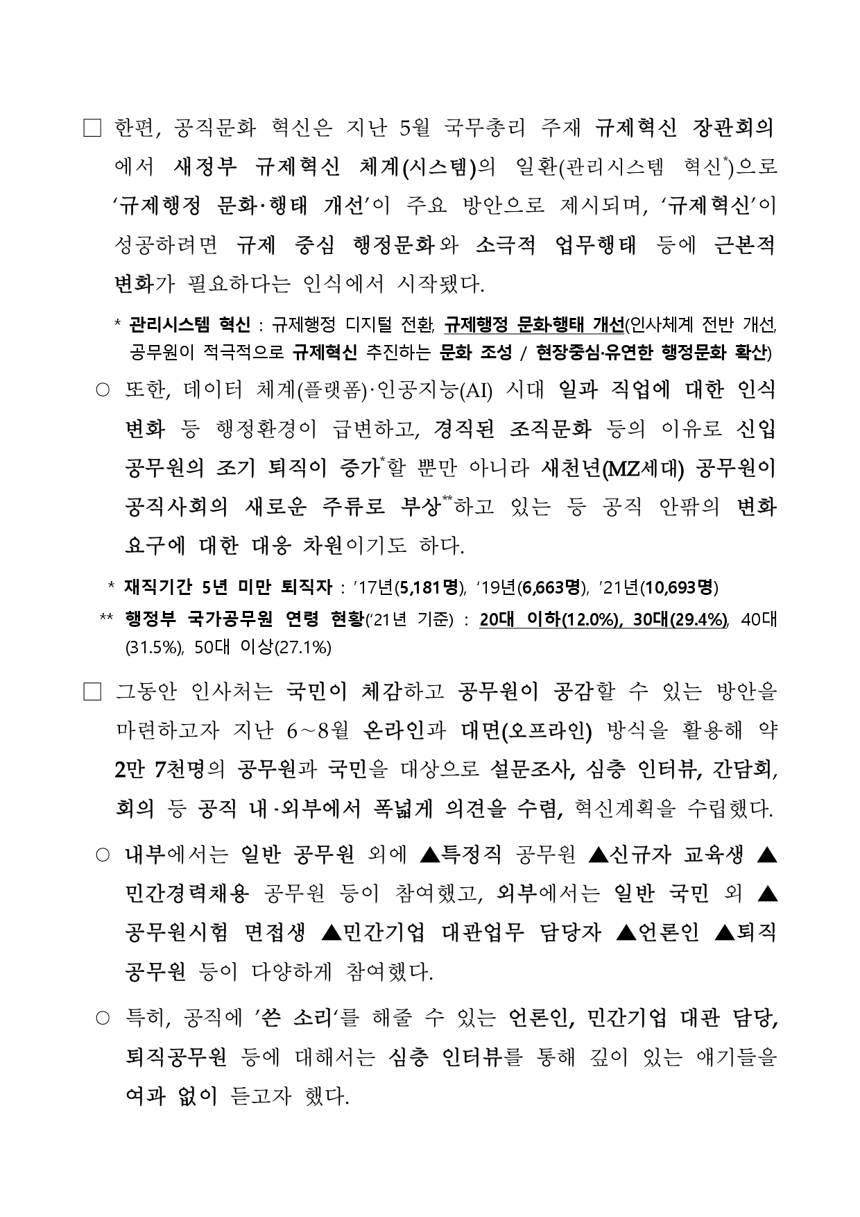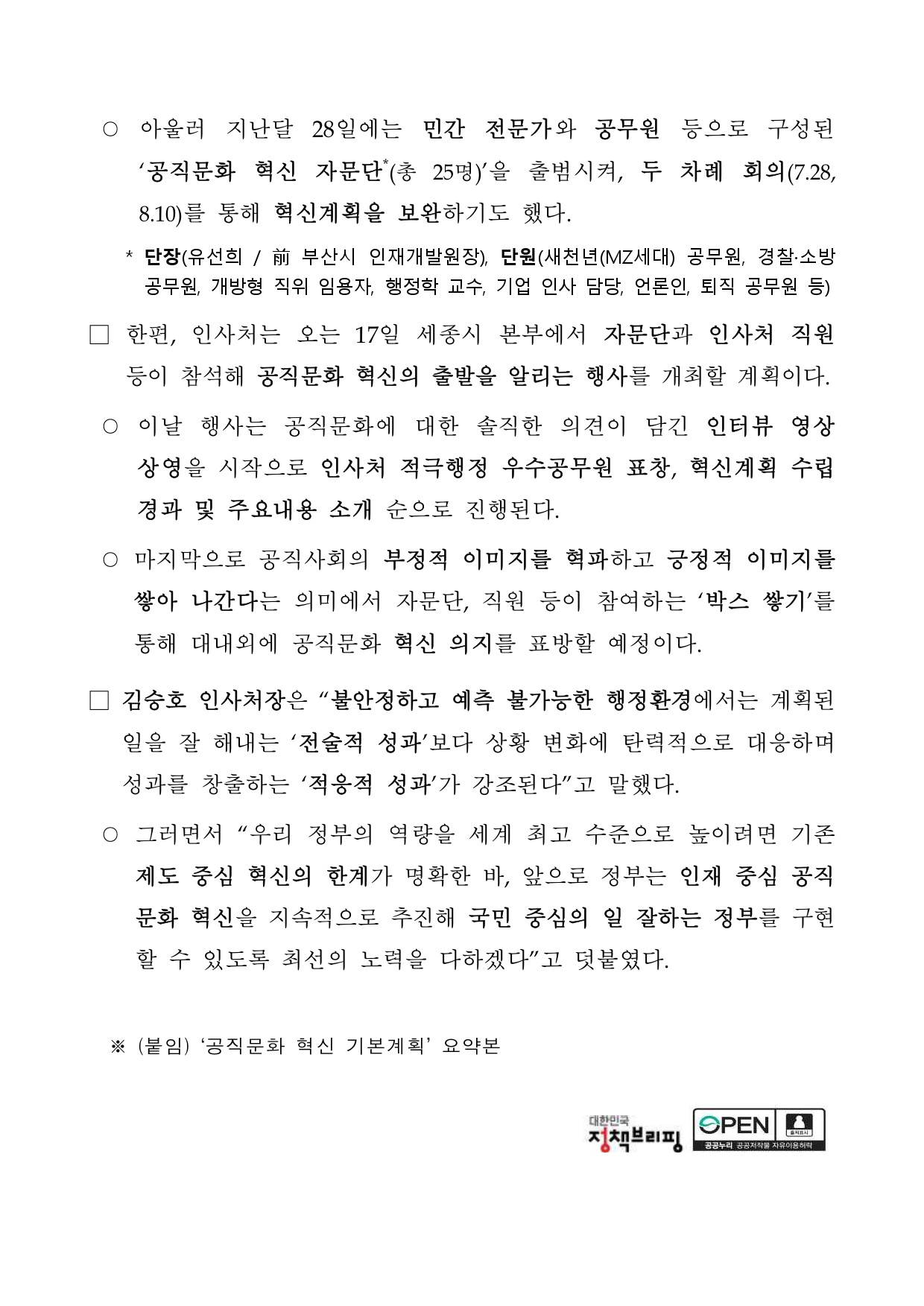 인사혁신처(처장 김승호)는 지난 6월 공직문화 혁신 추진 방침을 밝힌 뒤 약 2개월간 공직사회 내외부(약2만7천명)로부터 다양한 의견을 듣고 자문단 회의를 거쳐 실천방안을 포괄하는 「공직문화 혁신 기본계획」(이하, ‘혁신계획’)을 수립·발표한다고 17일 밝혔다.