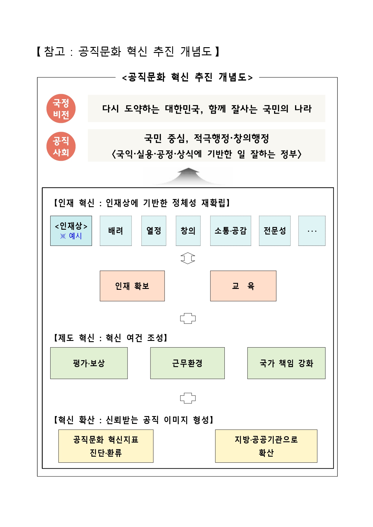 윤석열 정부 국정비전인 ‘다시 도약하는 대한민국, 함께 잘 사는 국민의 나라’ 구현을 공직사회가 뒷받침하기 위해 ‘공직문화 혁신’을 본격 추진한다.