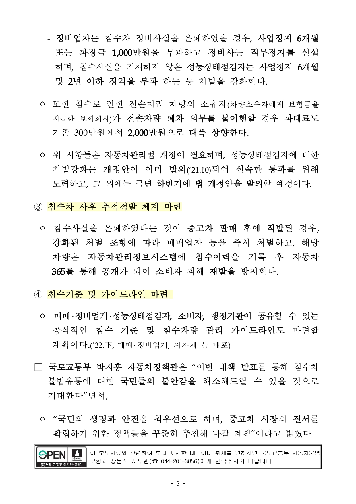 침수차 폐차까지 이력 관리 및 공개, 침수 사실 은폐 시 처벌 대폭 강화, 사후 추적 적발체계 구