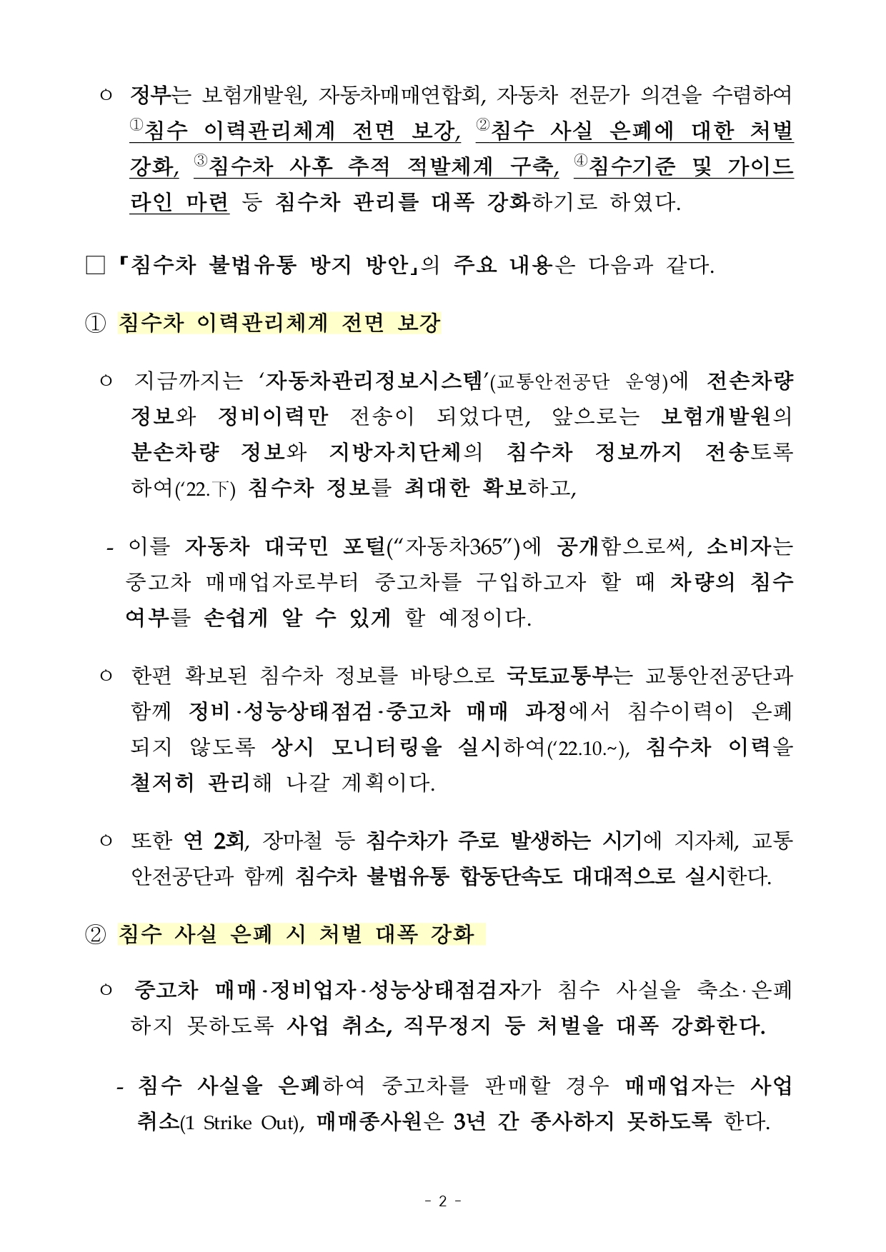 침수차 폐차까지 이력 관리 및 공개, 침수 사실 은폐 시 처벌 대폭 강화, 사후 추적 적발체계 구