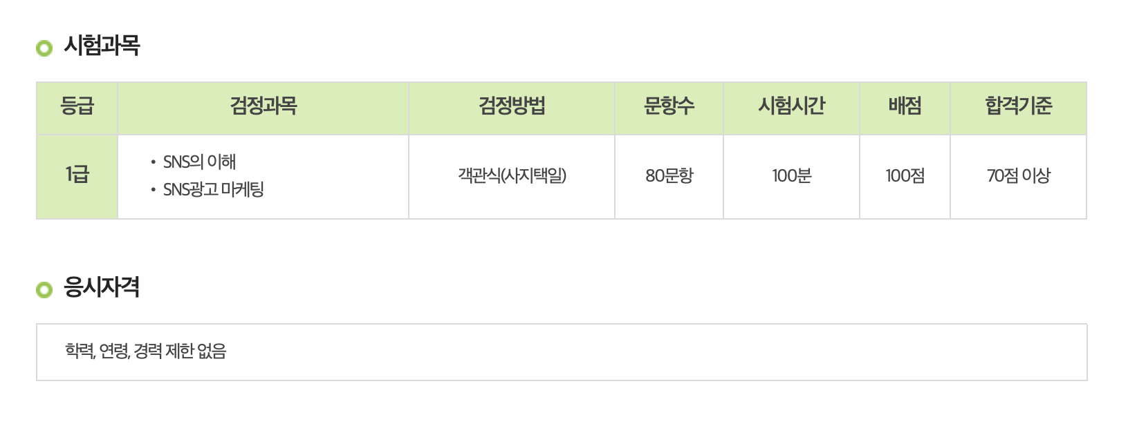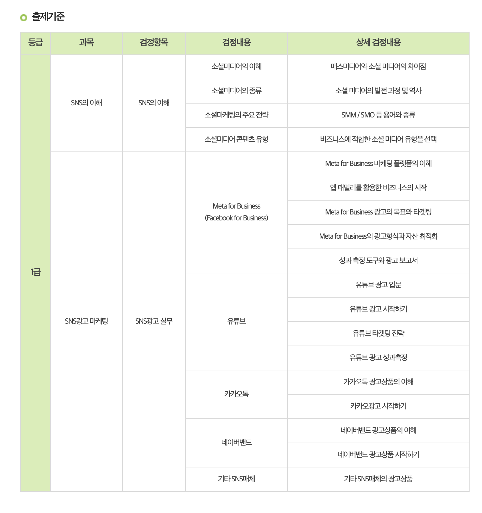 SNS광고의 기본지식을 보유하고, SNS광고 기획, 전략, 등록, 운영, 효과분석 등 실무적인 지식 및 역량을 평가하는 자격.