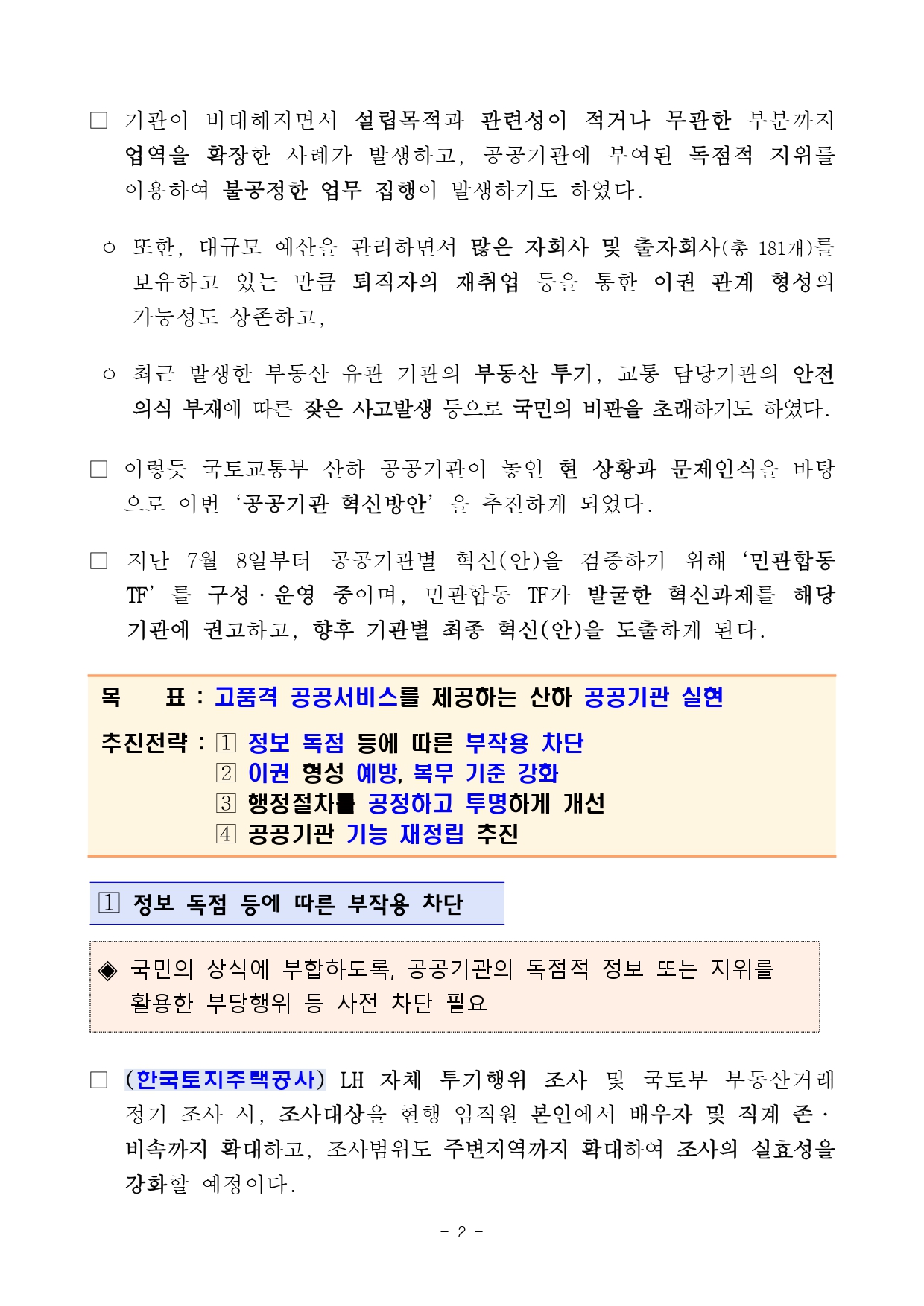 또한, 대규모 예산을 관리하면서 많은 자회사 및 출자회사(총 181개)를 보유하고 있는 만큼 퇴직자의 재취업 등을 통한 이권 관계 형성의 가능성도 상존하고, 최근 발생한 부동산 유관 기관의 부동산 투기, 교통 담당기관의 안전의식 부재에 따른 잦은 사고발생 등으로 국민의 비판을 초래했다.
