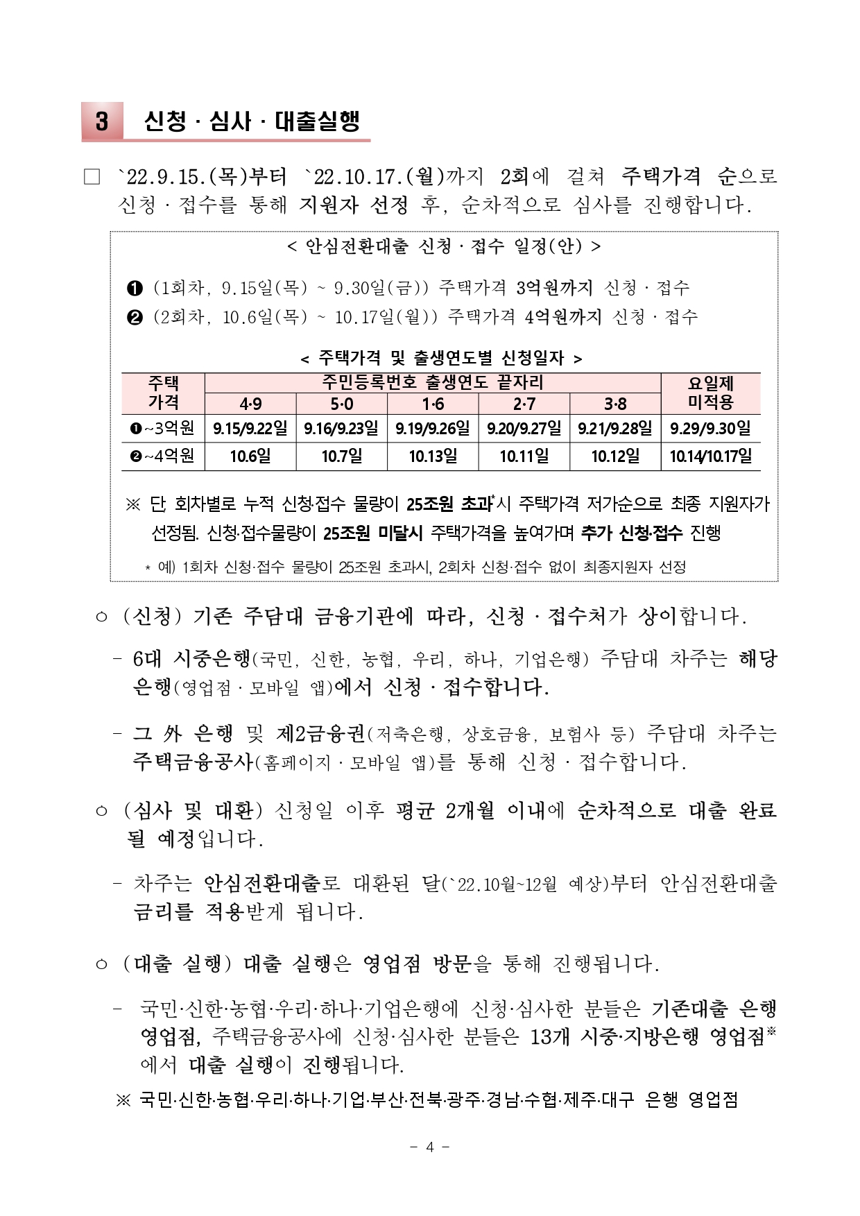 금번 신청·접수는 시가 4억원 이하 1주택 보유자를 대상으로 9.15 ~10.17일간(주말·휴일제외) 진행되며, 기존대출 금융기관에 따라 신청 접수처가 달리 운영됩니다.