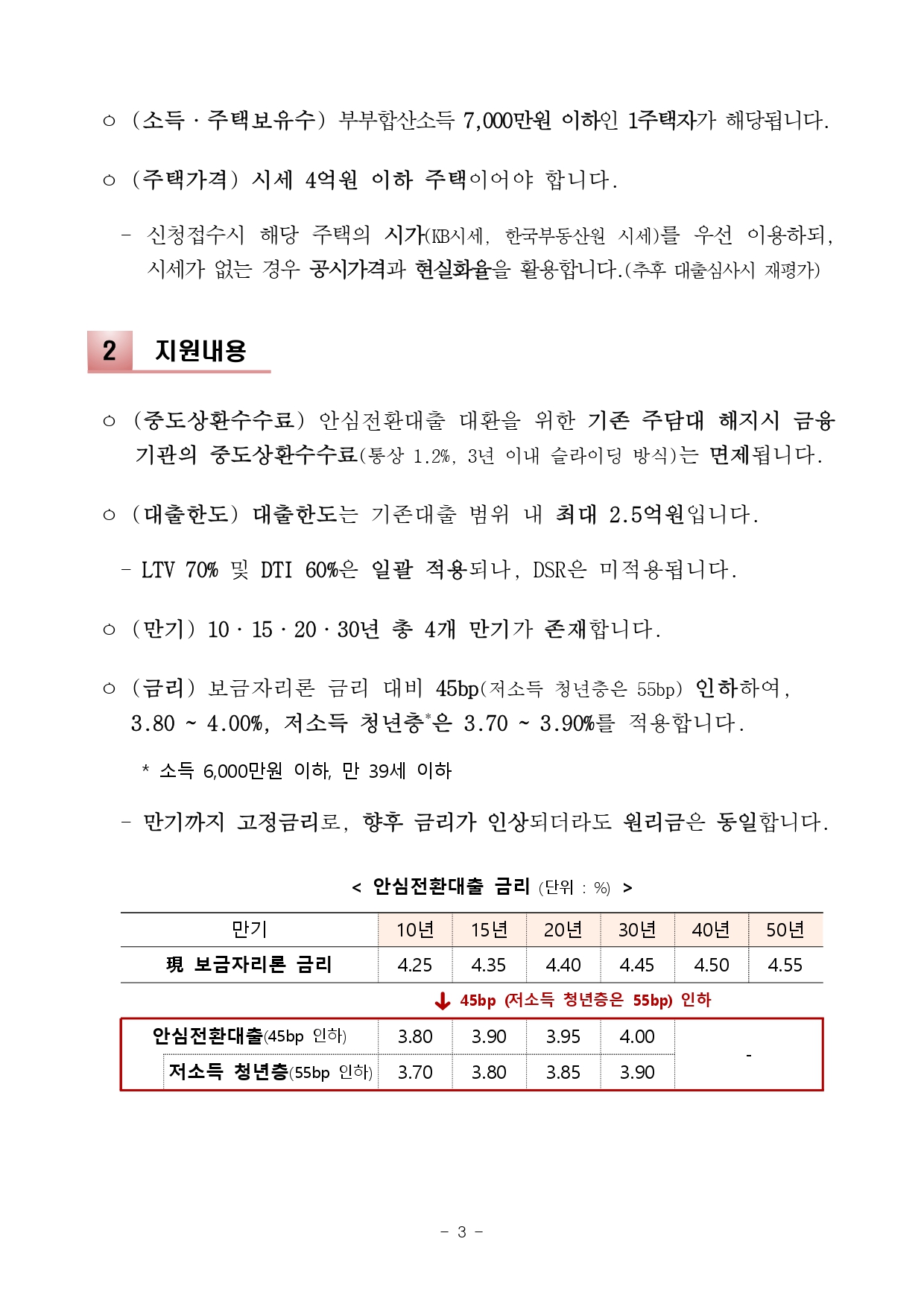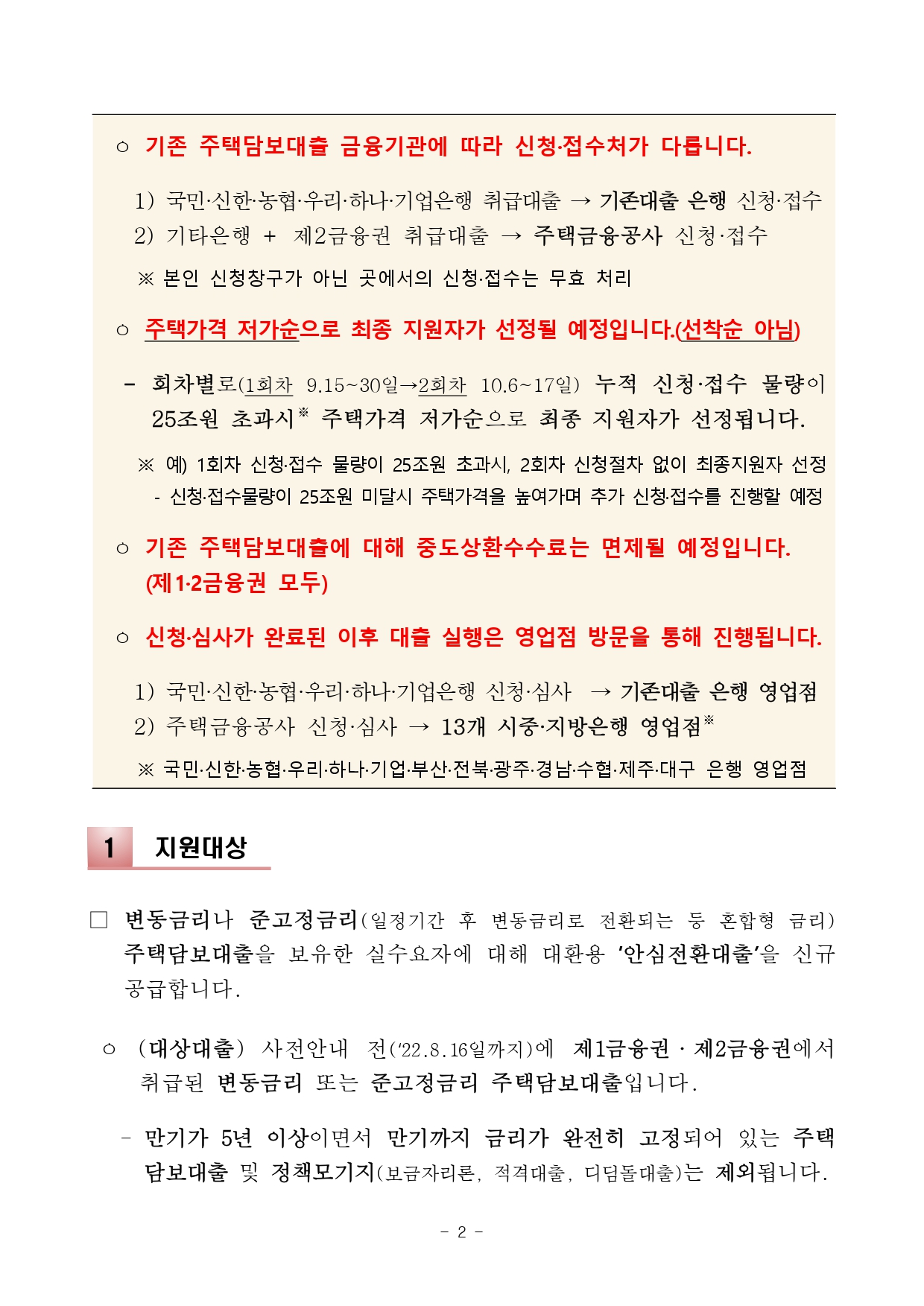 9월 15일(목)부터 서민·실수요자가 보유한 변동금리·준고정금리(혼합형) 주택담보대출을 저금리의 장기·고정금리·분할상환 상품으로 갈아타는 우대형 안심전환대출(25조원) 신청·접수가 시작됩니다.