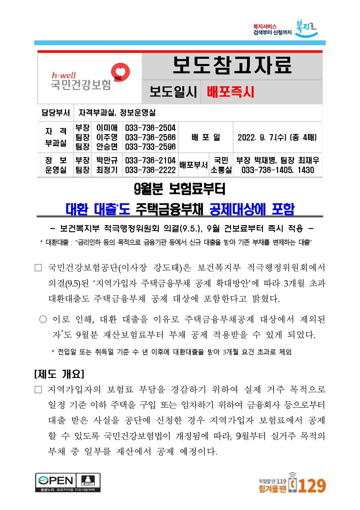 국민건강보험공단(이사장 강도태)은 보건복지부 적극행정위원회에서 의결(9.5)된 ‘지역가입자 주택금융부채 공제 확대방안’에 따라 3개월 초과 대환대출도 주택금융부채 공제 대상에 포함한다고 밝혔다.