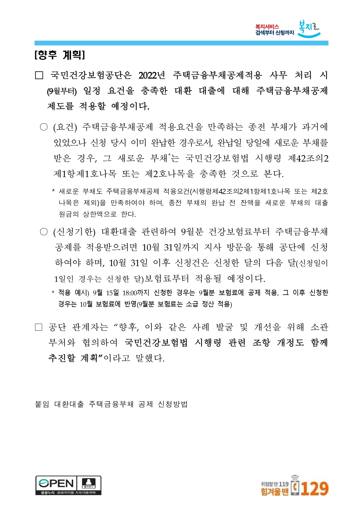 이로 인해, 대환 대출을 이유로 주택금융부채공제 대상에서 제외된자*도 9월분 재산보험료부터 부채 공제 적용받을 수 있게 되었다.