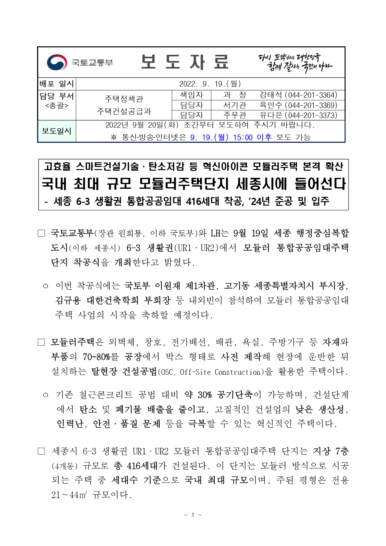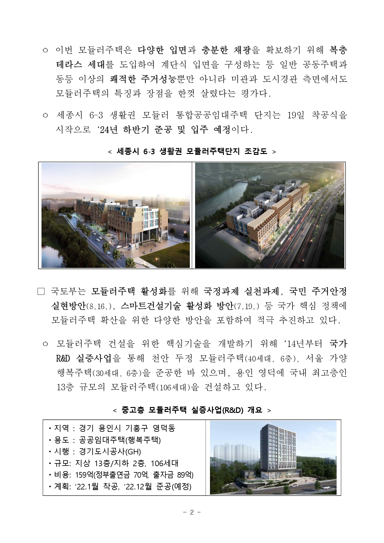 국토교통부(장관 원희룡, 이하 국토부)와 LH가 세종 행정중심복합도시(이하 세종시) 6-3 생활권(UR1·UR2)에 모듈러 통합공공임대주택을 짓는다.