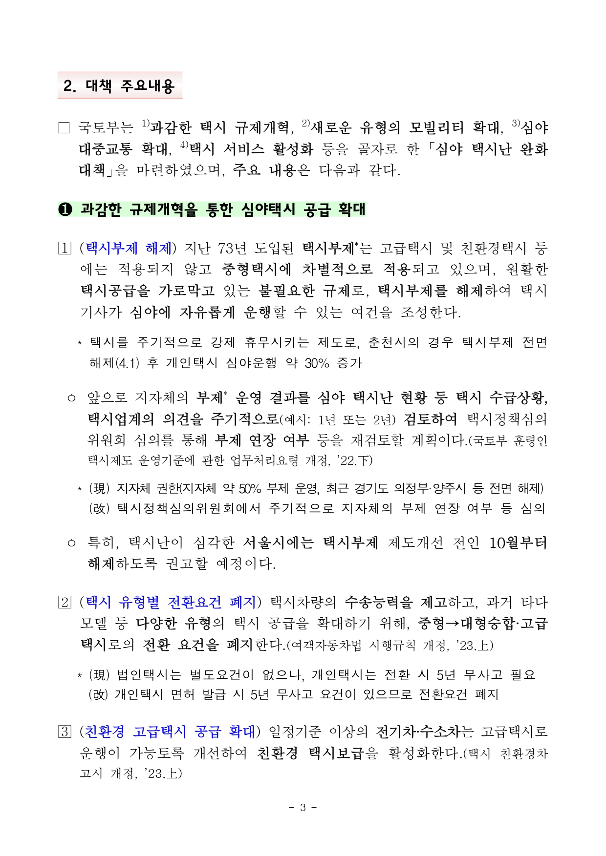 국토교통부(장관 원희룡)는 심야 택시난으로 인한 국민 불편을 해소하기 위해, 국정현안관계장관회의(9.23) 및 당정협의(9.28), 고위당정협의(10.3) 등을 거쳐 「심야 택시난 완화 대책」을 발표했다.