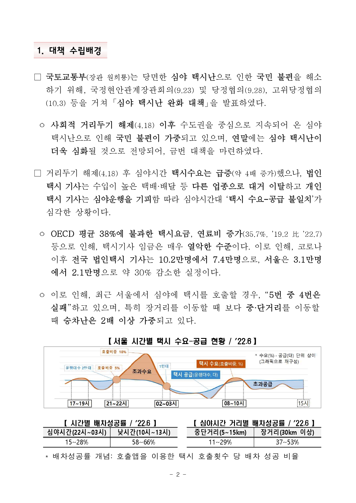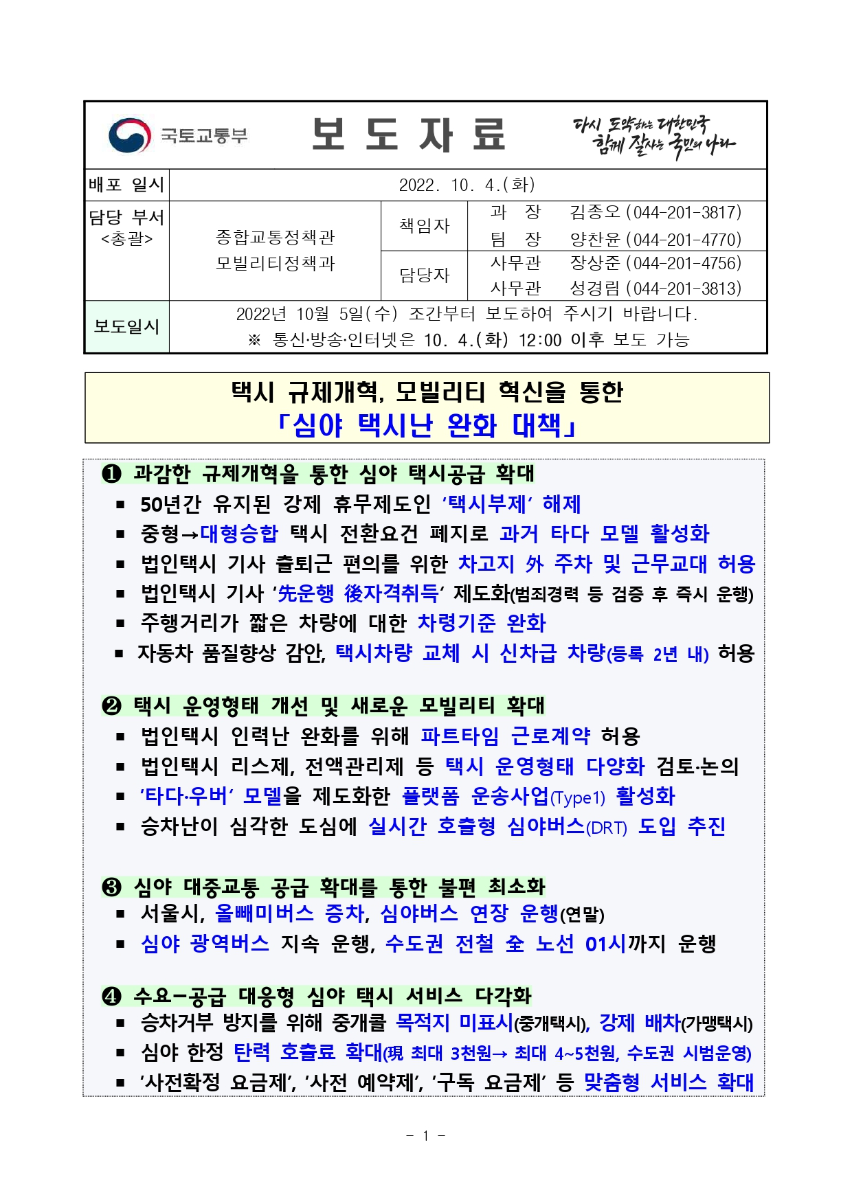 국토교통부(장관 원희룡)는 심야 택시난으로 인한 국민 불편을 해소하기 위해, 국정현안관계장관회의(9.23) 및 당정협의(9.28), 고위당정협의(10.3) 등을 거쳐 「심야 택시난 완화 대책」을 발표했다.