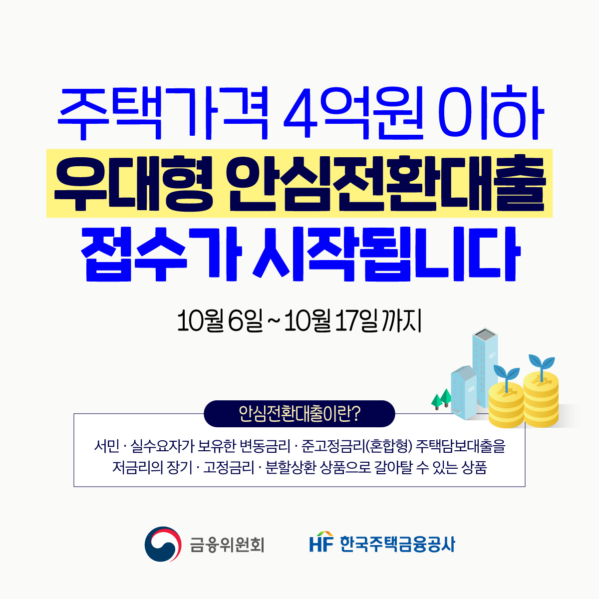 주택가격 4억원 이하 우대형 안심전환대출 접수 시작!