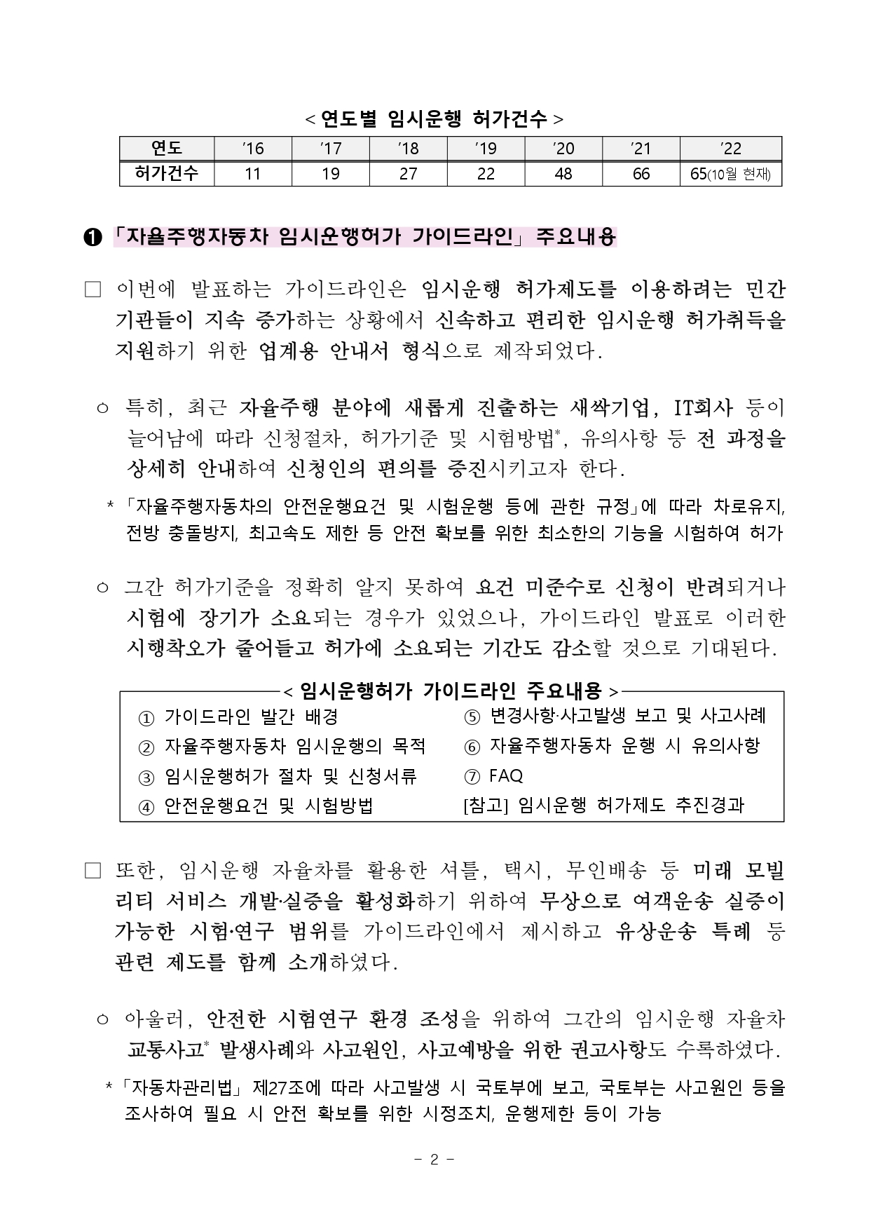 국토교통부(장관 원희룡)는 10월 26일 자율주행 기술개발 편의증진과모빌리티 서비스 개발 촉진을 위하여 「자율주행자동차 임시운행허가 가이드라인」을 발표했다.