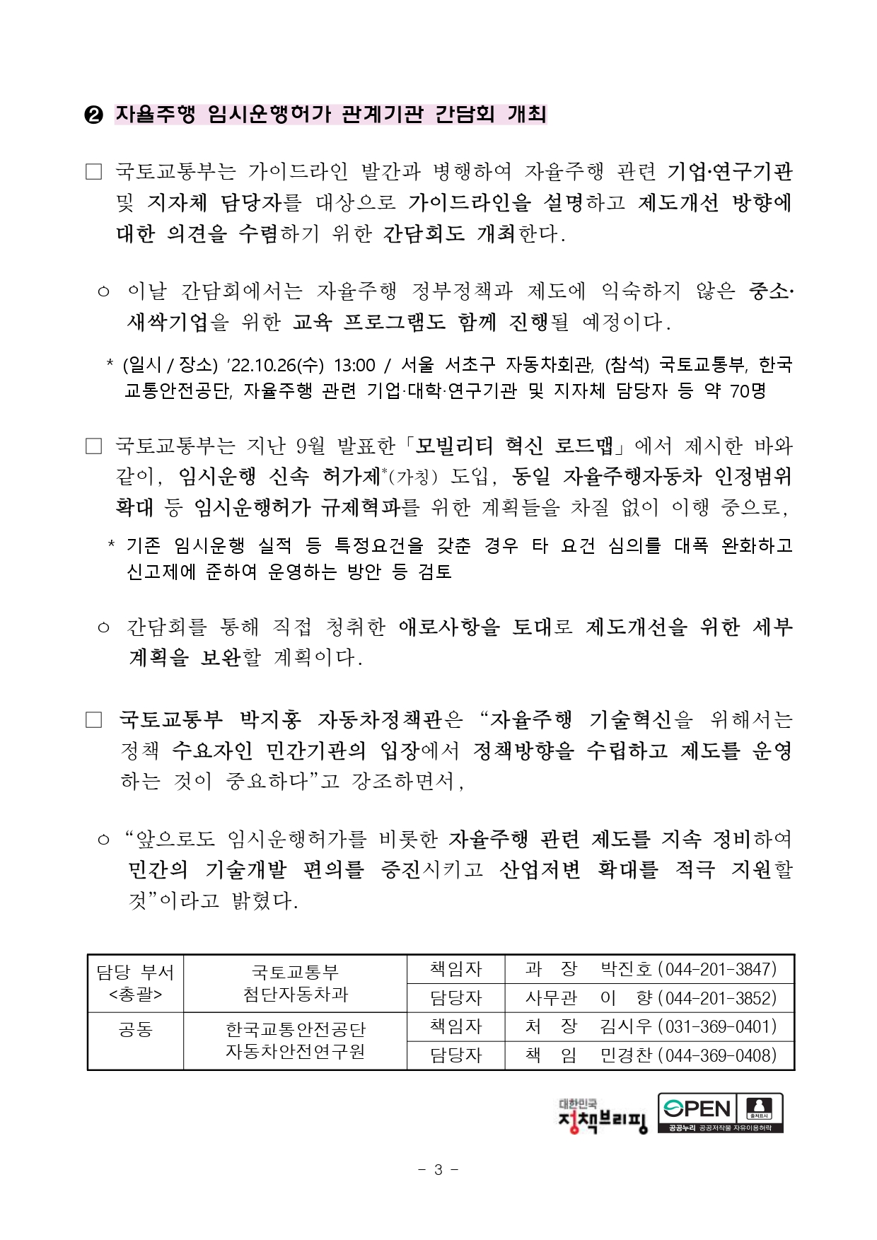 국토교통부(장관 원희룡)는 10월 26일 자율주행 기술개발 편의증진과 모빌리티 서비스 개발 촉진을 위하여「자율주행자동차 임시운행허가 가이드라인」을 발표하고 자율주행 관계기관 간담회