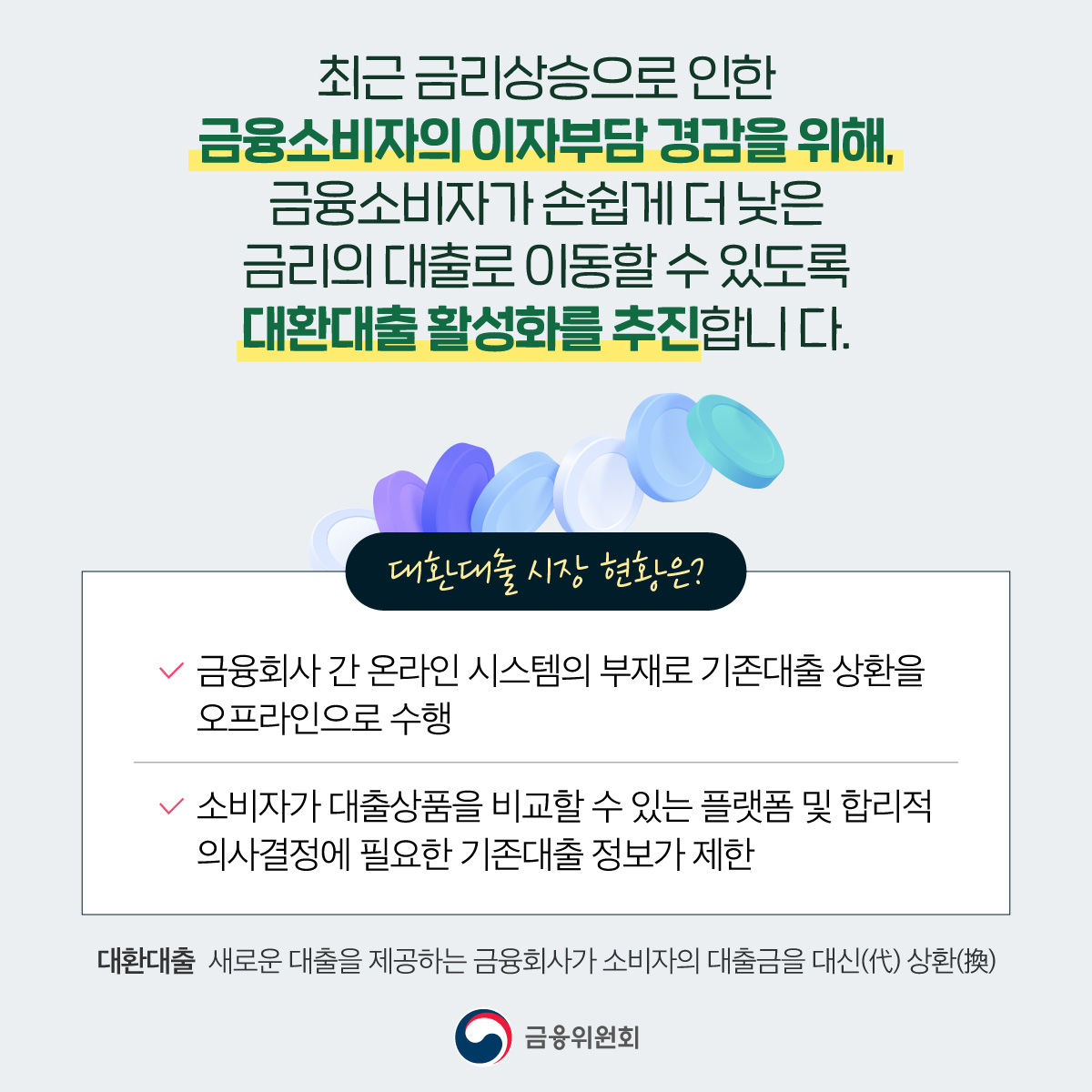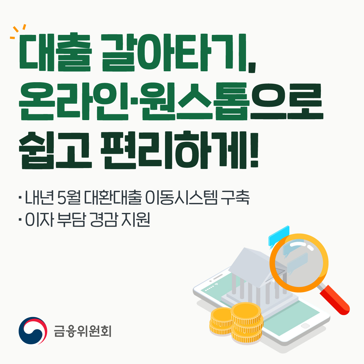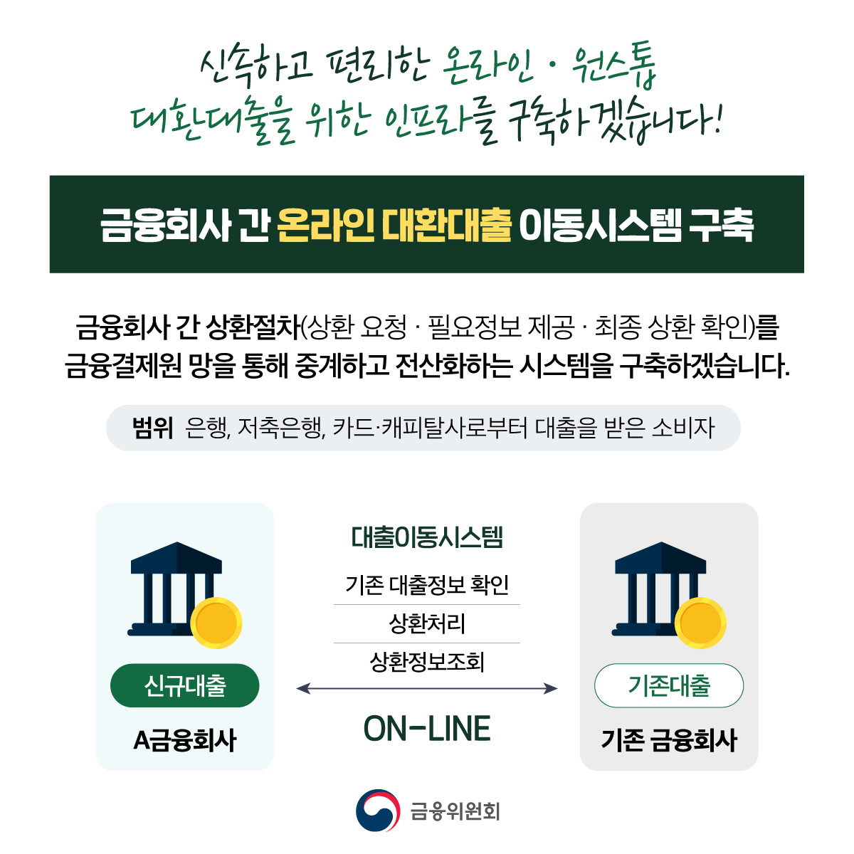 대출 갈아타기, 온라인·원스톱으로 쉽고 편리하게! 2022-11-15 최근 금리상승으로 인한 금융소비자의 이자부담을 경감하기 위해, 금융소비자가 손쉽게 더 낮은 금리의 대출로 이동할 수 있도록 신