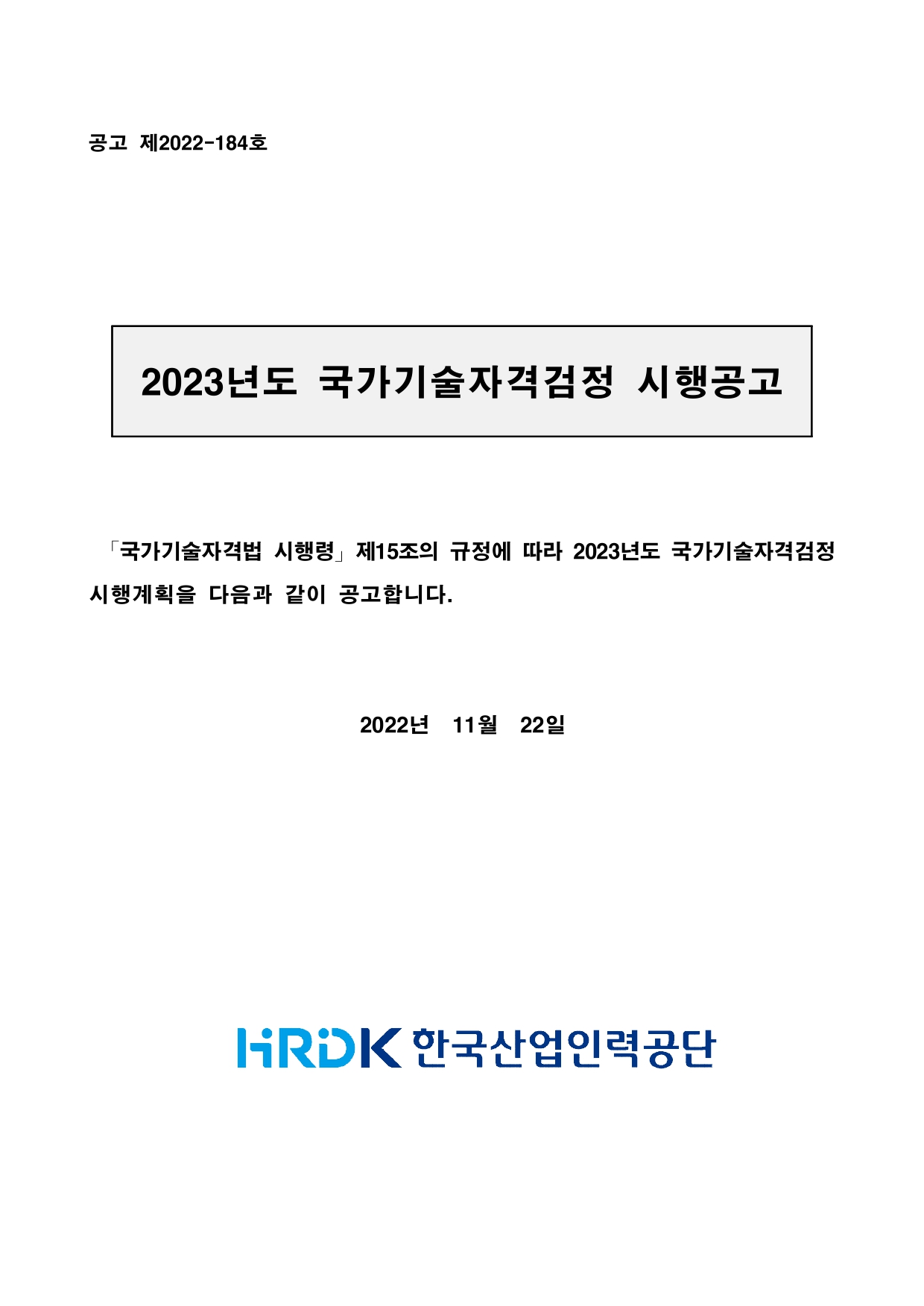 국가기술자격법 시행령 제15조의 규정에 따라 2023년도 국가기술자격검정 시행계획을 다음과 같이 안내해드립니다.