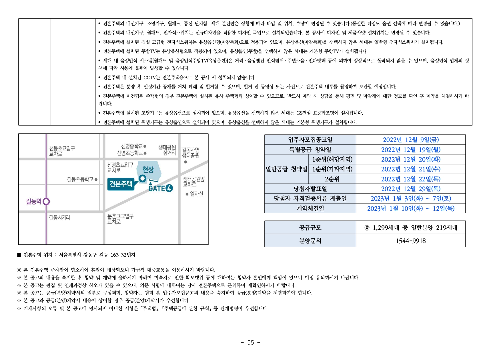 - 해당 주택건설지역(서울특별시 강동구)은 「주택법」 제63조 및 제63조의2에 의한 투기과열지구 및 청약과열지역으로서, 본 아파트는 「주택공급에 관한 규칙」에 따라 1주택 이상 소유한 세대에 속한 분은 1순위 가점제 청