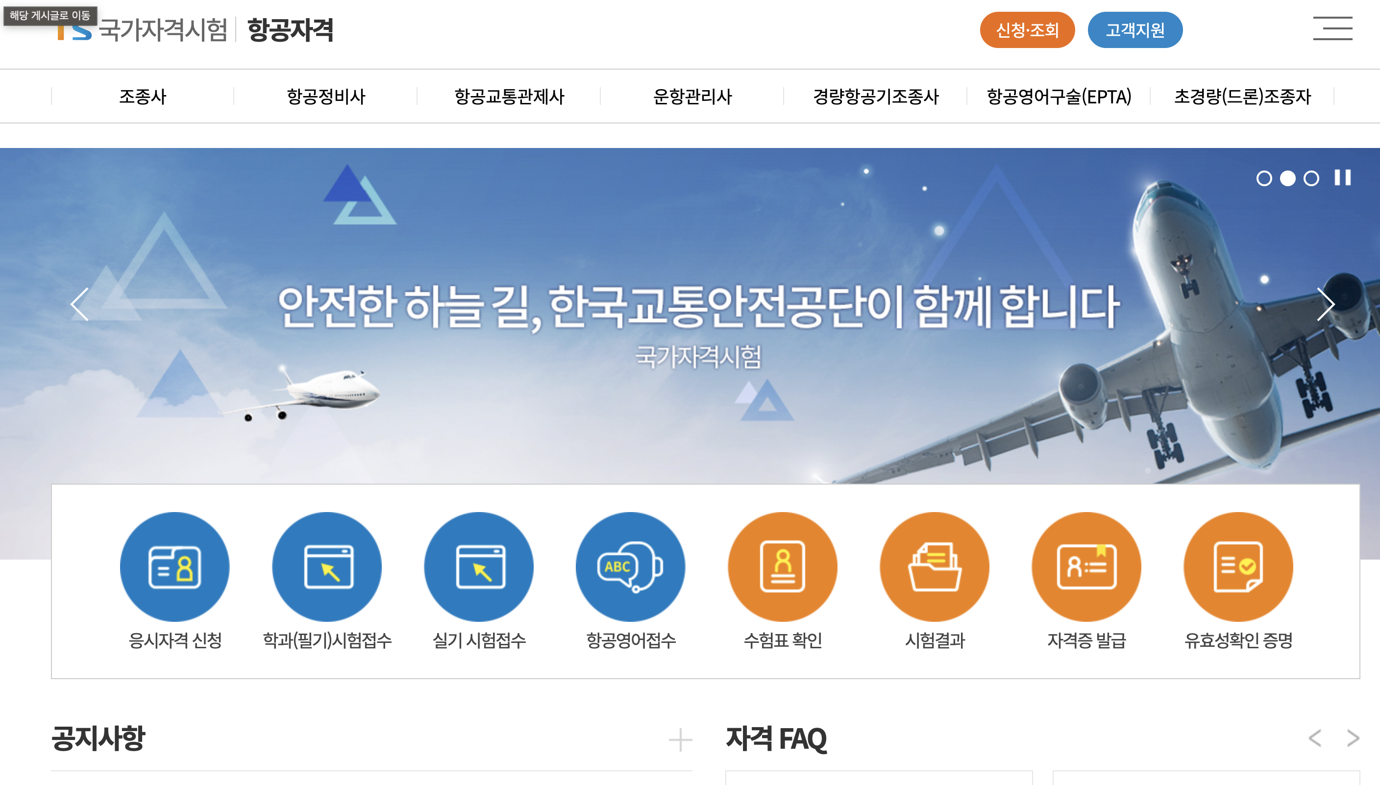 한국교통안전교통공단 홈페이지에 접속하면 학과시험 신청 코너가 있다.