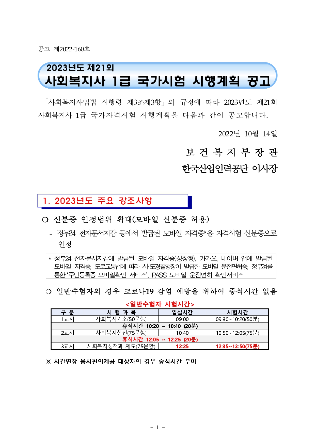 「사회복지사업법 시행령 제3조제3항」의 규정에 따라 2023년도 제21회 사회복지사 1급 국가자격시험 시행계획을 다음과 같이 공고합니다.