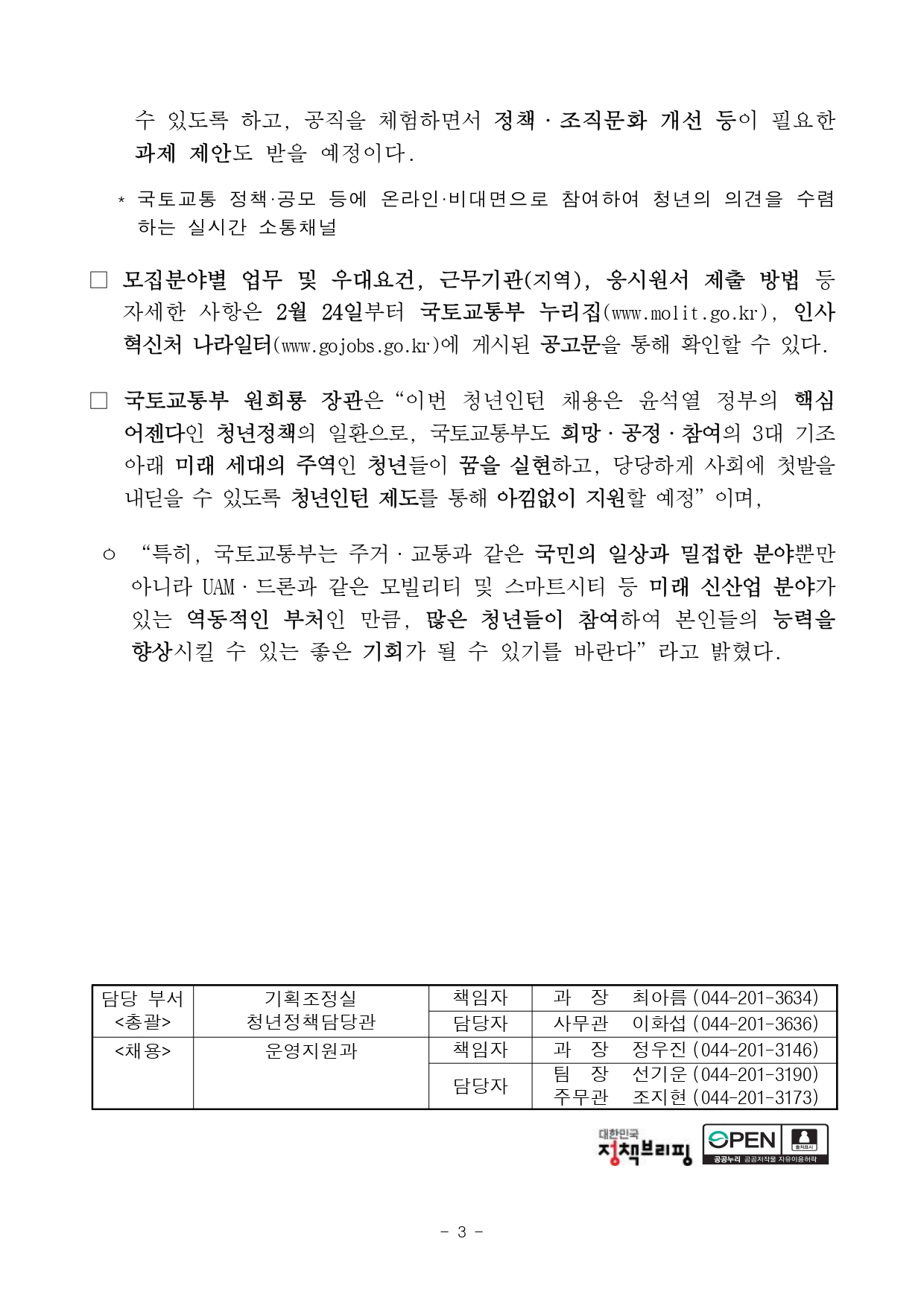 국토교통부(장관 원희룡)가 청년의 공공부문 일경험을 제공하고, 국토교통 분야 정책의 수립과 집행과정에 청년의 참여를 활성화하기 위하여 2월 24일부터 3월 9일까지 청년인턴을 모집합니다.