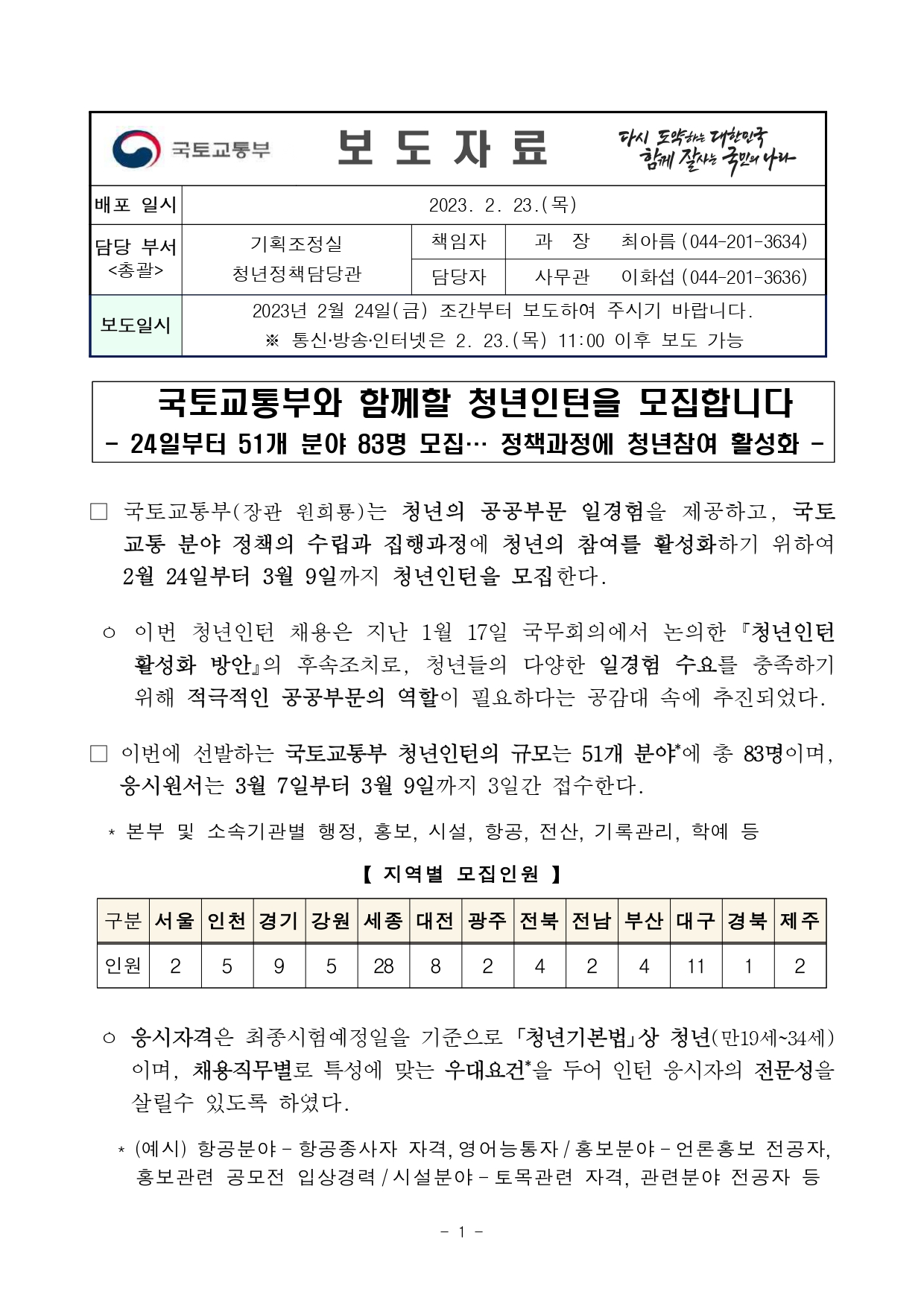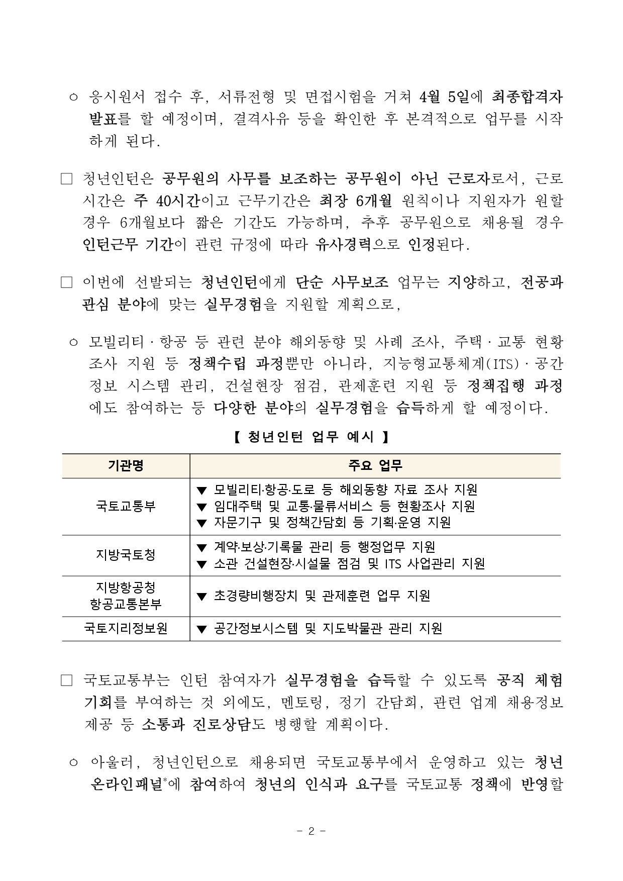 국토교통부(장관 원희룡)는 청년의 공공부문 일경험을 제공하고, 국토교통 분야 정책의 수립과 집행과정에 청년의 참여를 활성화하기 위하여 2월 24일부터 3월 9일까지 청년인턴을 모집