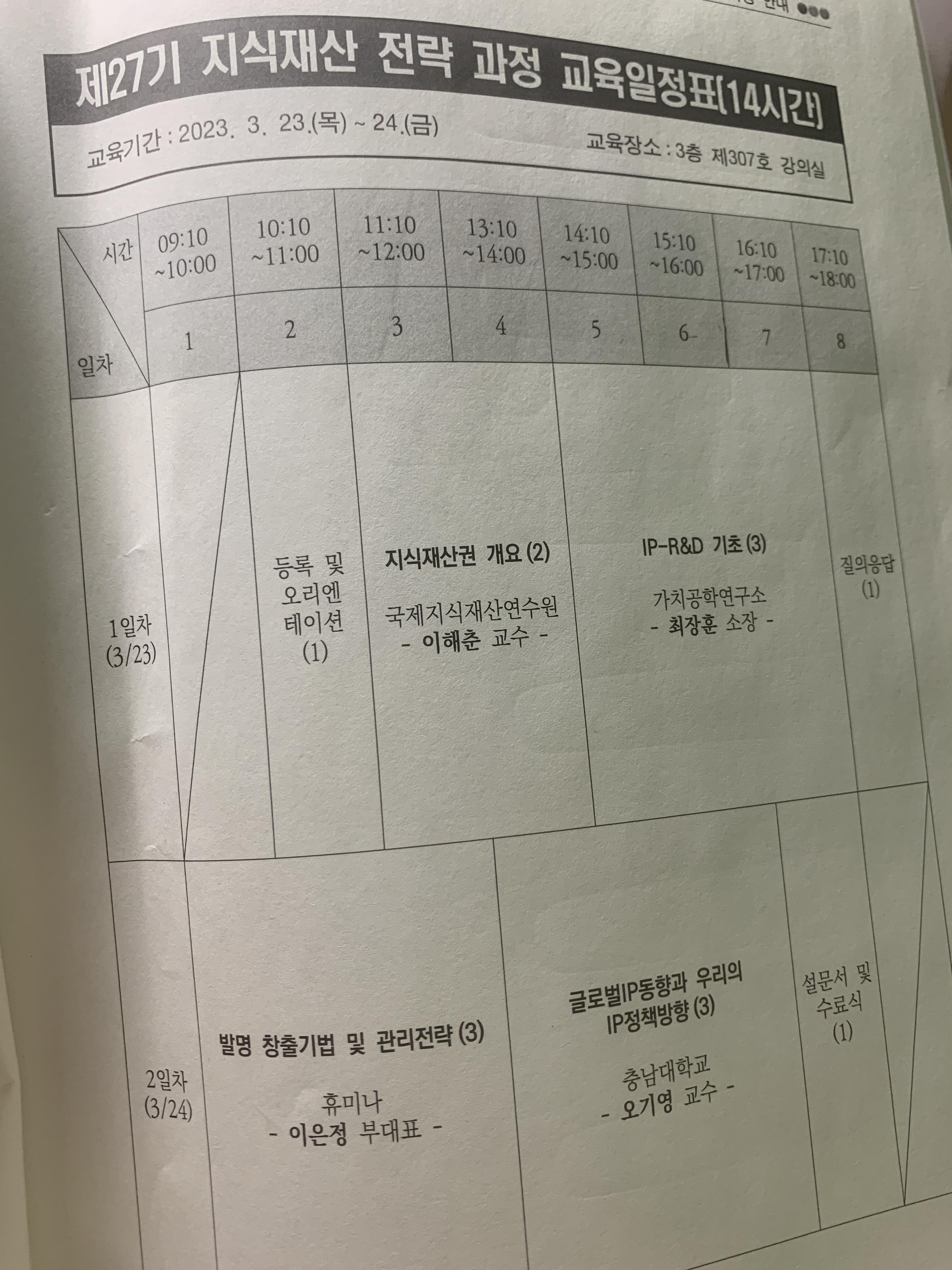 특허청 국제지식재산연수원 홈페이지에 들어가면 교육 커리큘럼이 나와있으니 참고하면 될 것 같다.