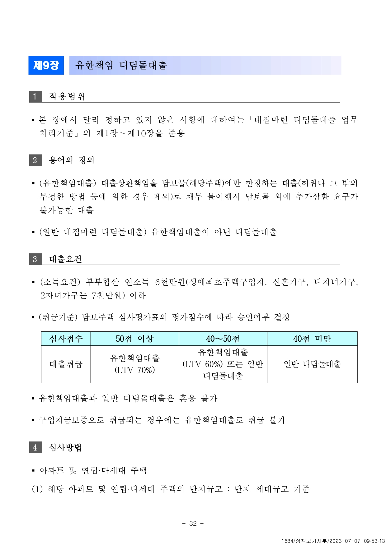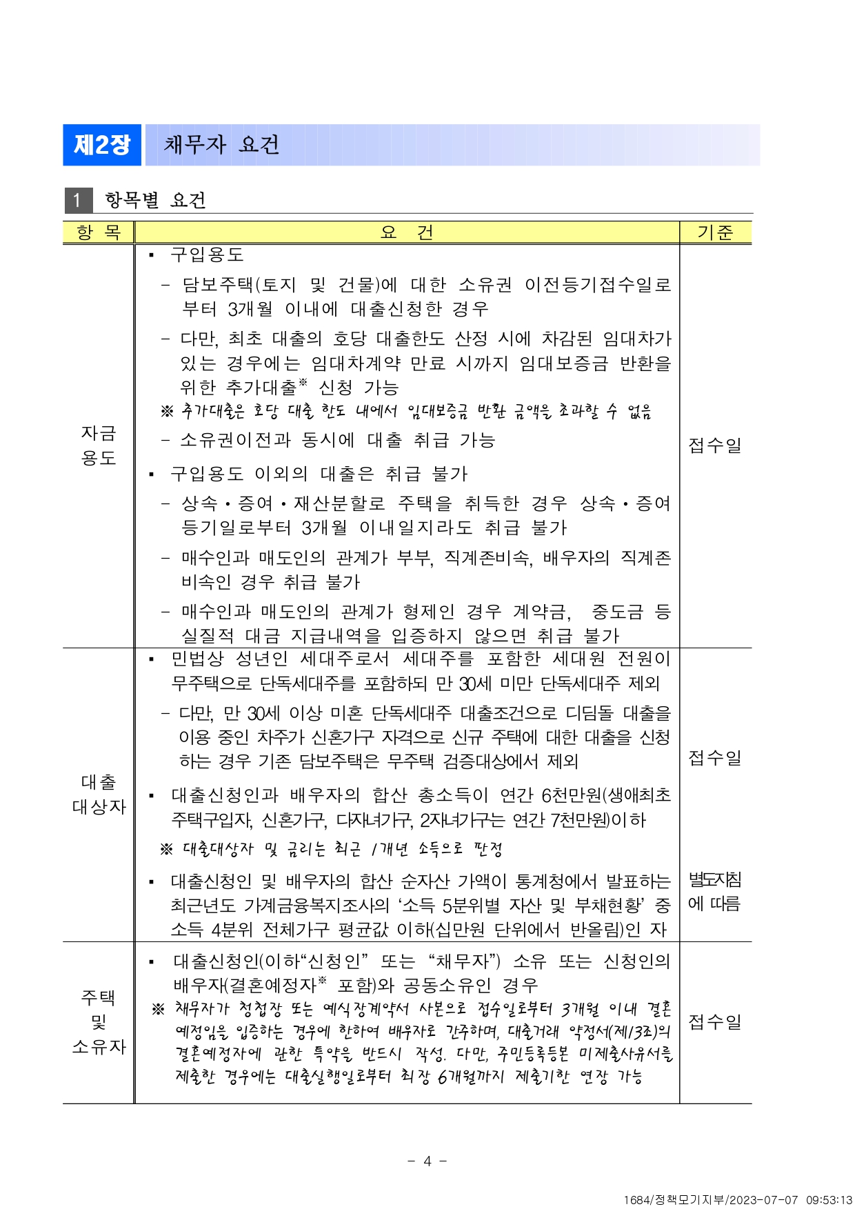 신청대상 민법상 성년 대한민국 국민 접수일 현재 세대주 한국신용정보원 신용정보관리규약 해당사항 없고 CB점수 350점 이상 본인 및 배우자 합산 순자산 가액 5.06억원 이하 대출요건 5억원(신