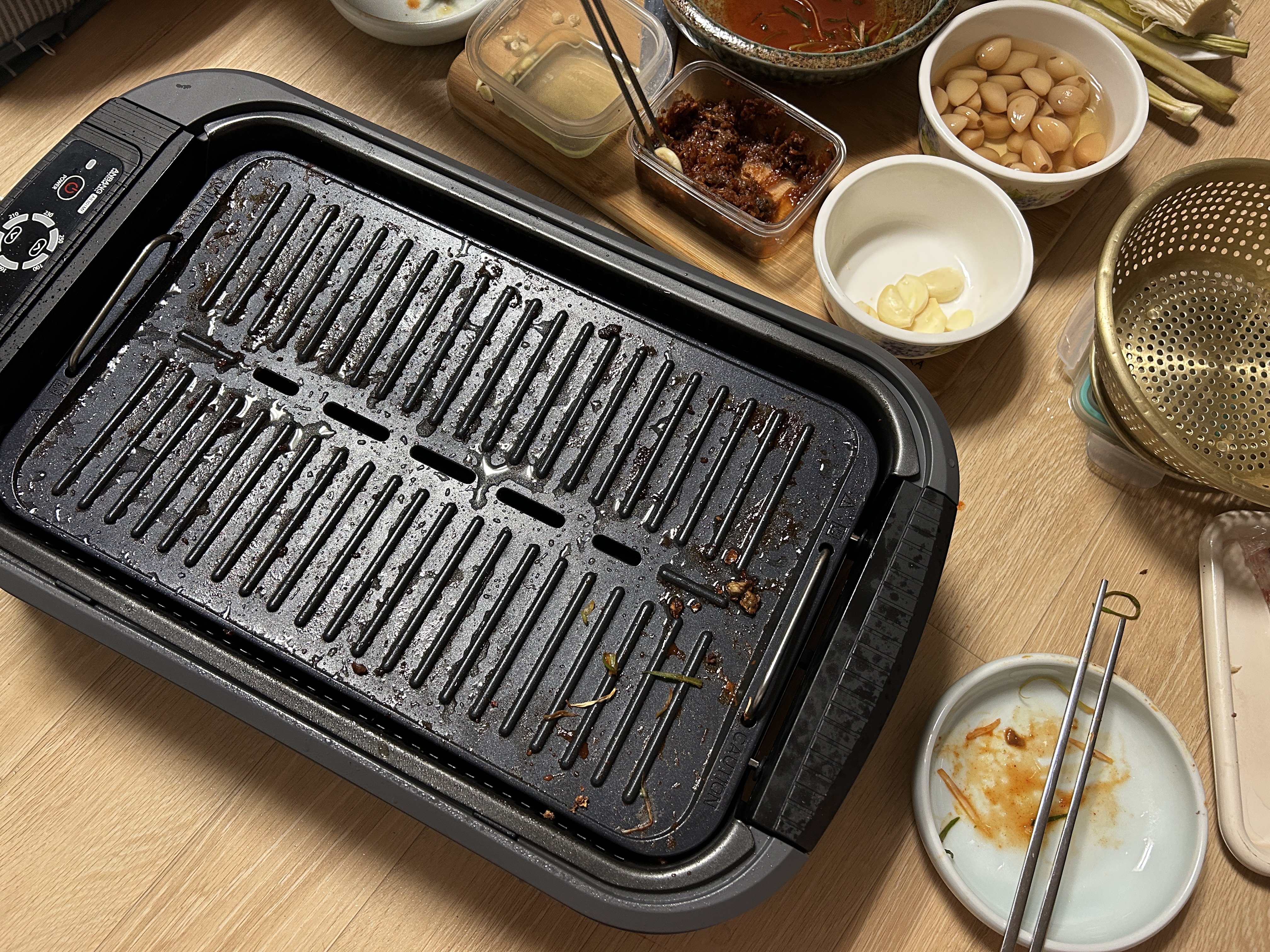 냉동고에서 오래 묵힌 삼겹살을 새로 산 그릴에 구워먹었다.