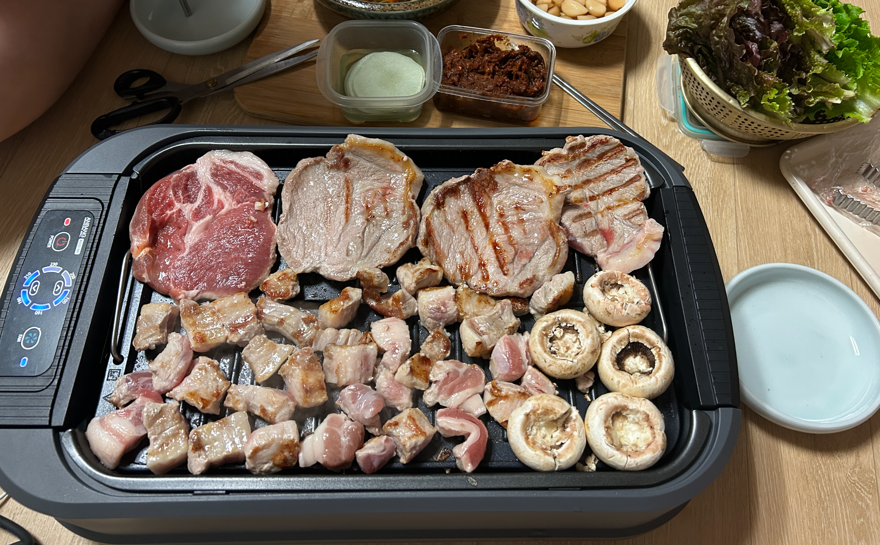 냉동고에서 오래 묵힌 삼겹살을 새로 산 그릴에 구워먹었다.