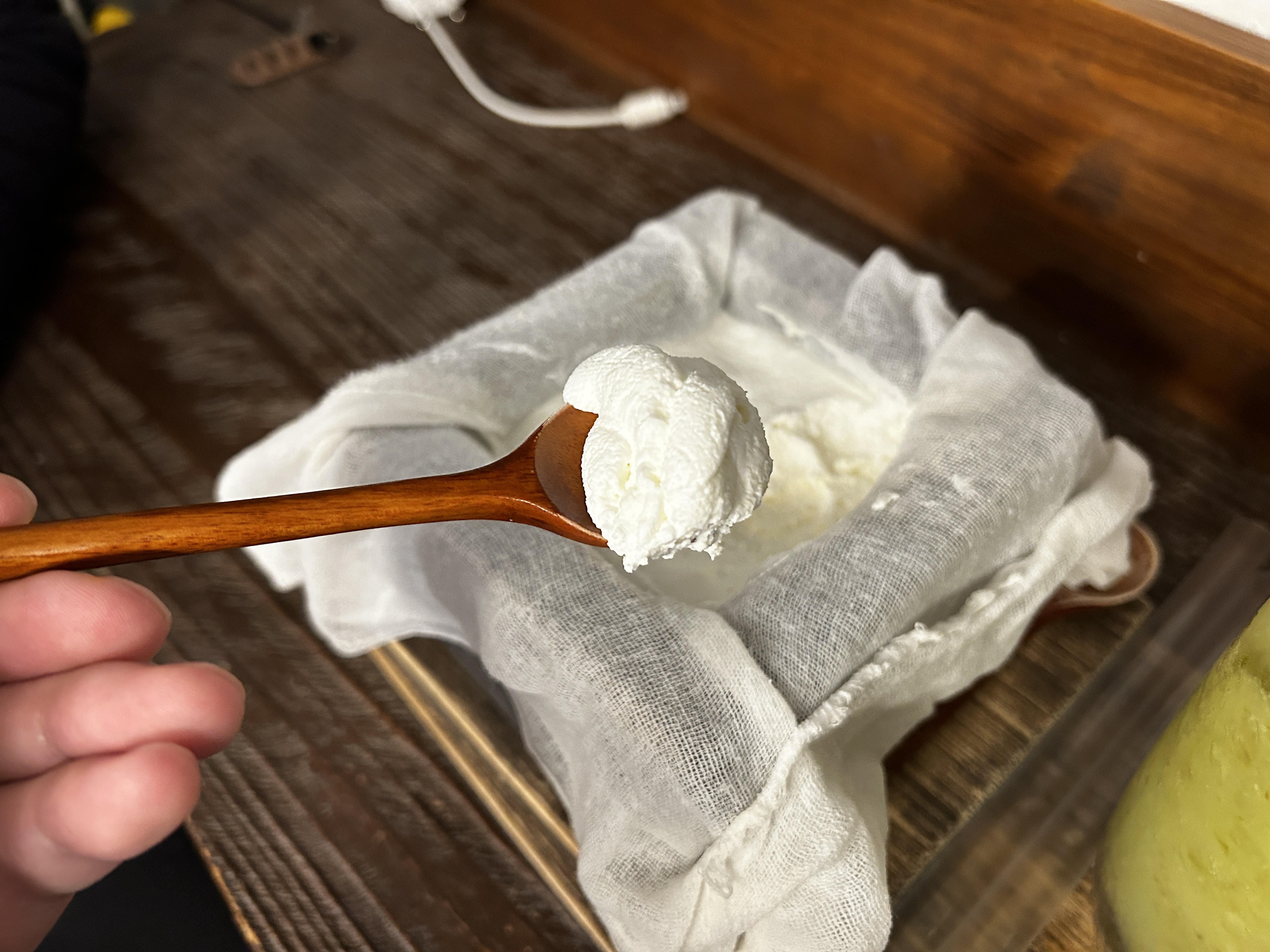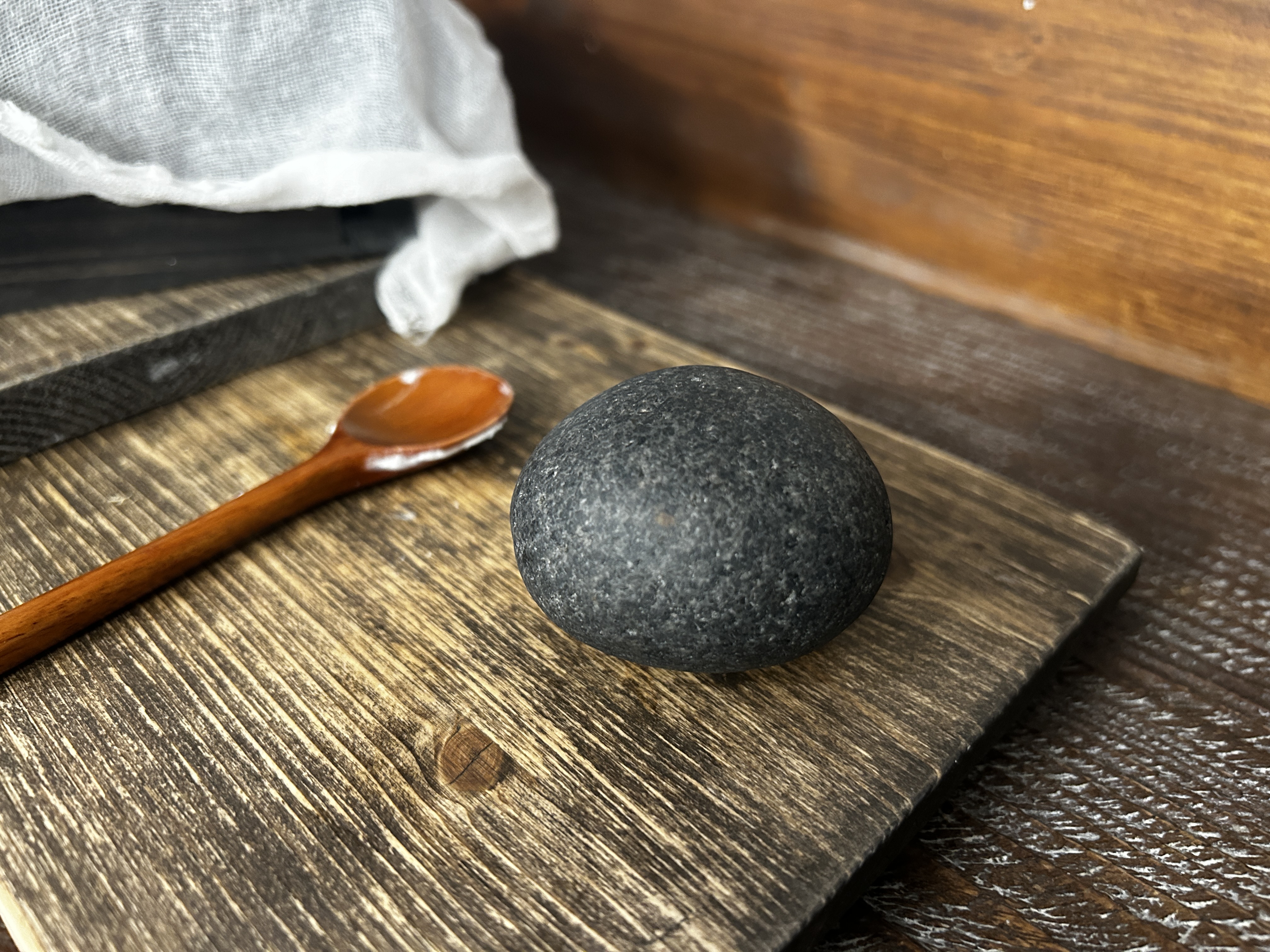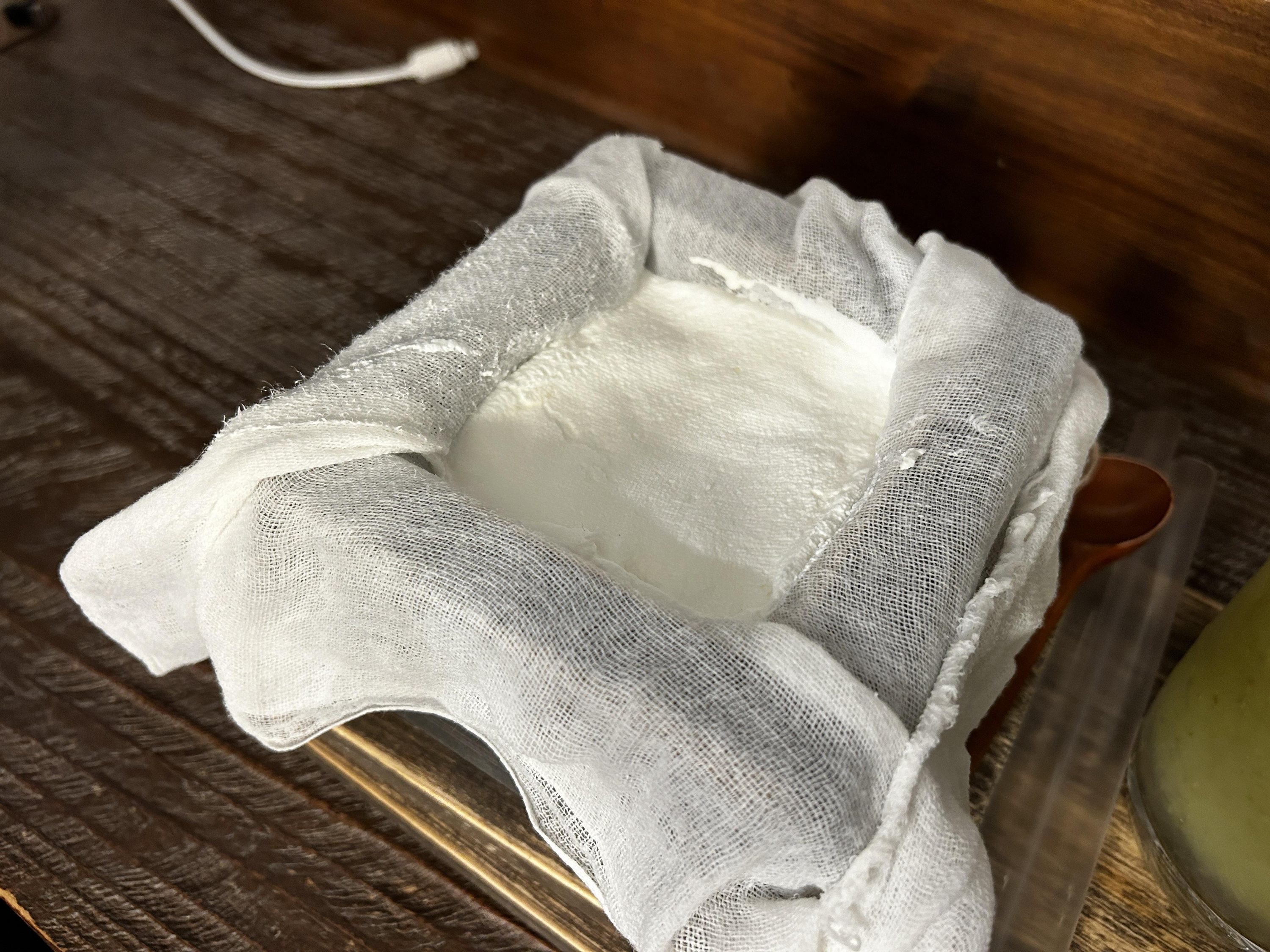 치즈 한모는 두부처럼 생겼다. 둥근 돌이 올라가 있다.