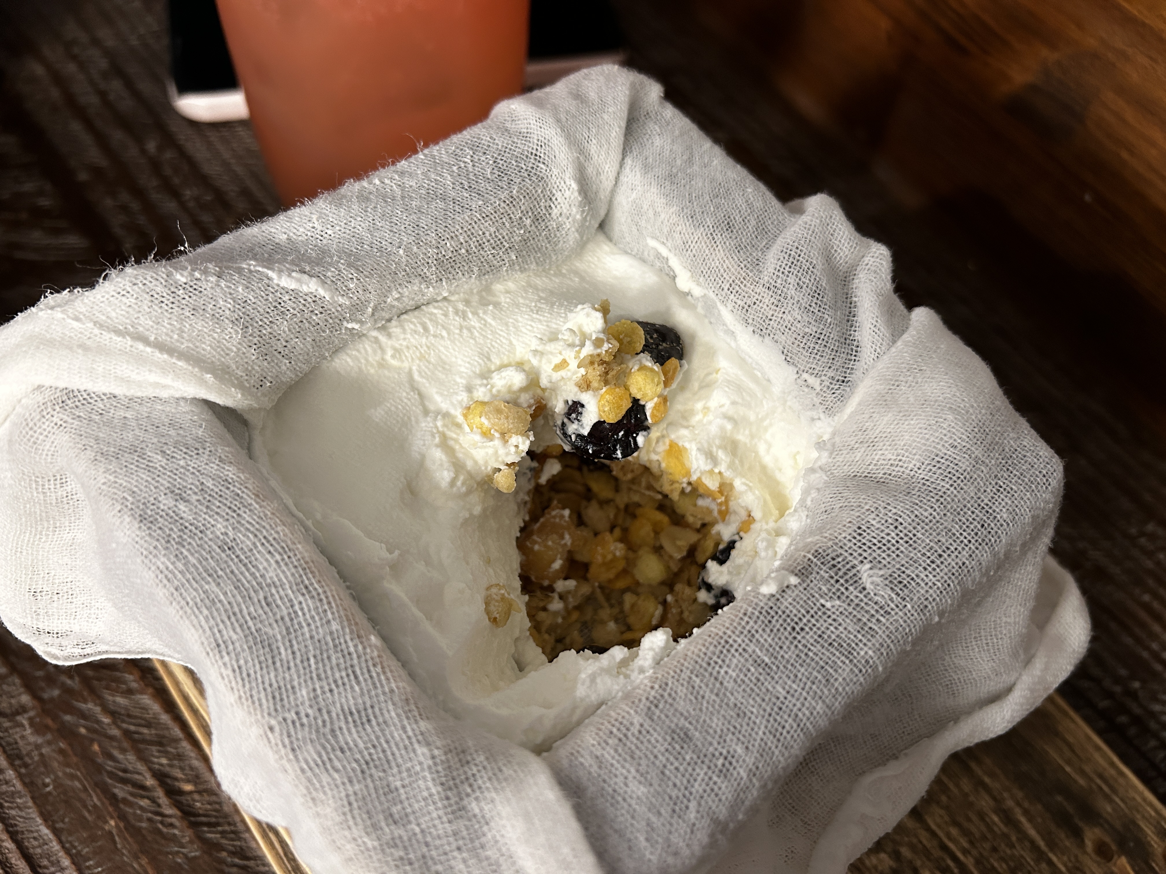 치즈 한모는 두부처럼 생겼다. 둥근 돌이 올라가 있다.