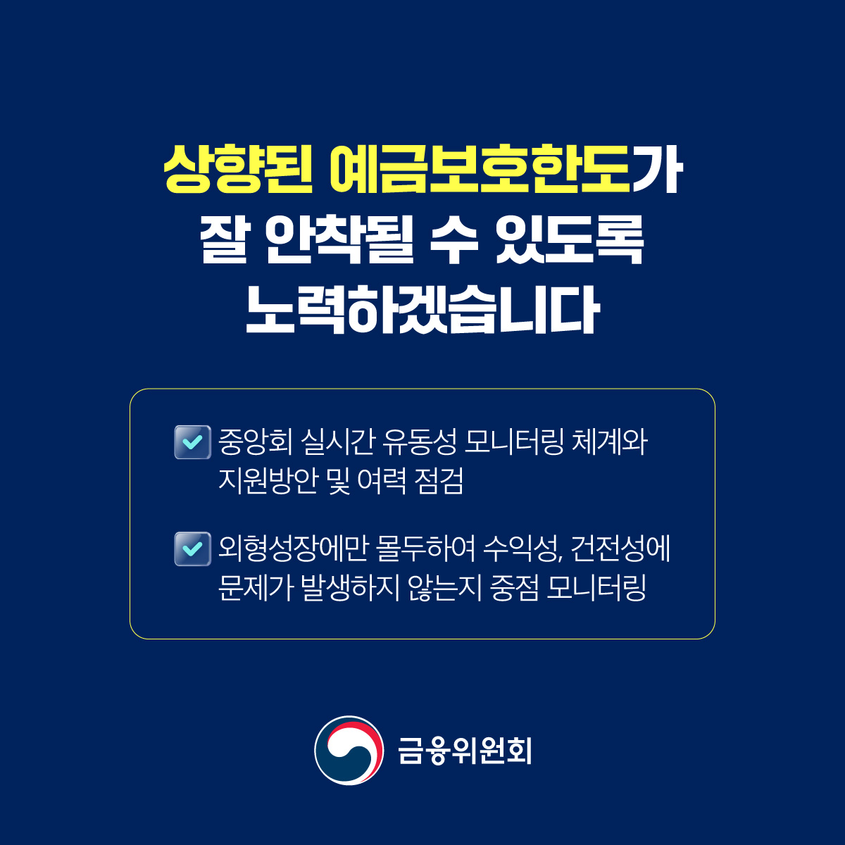 또한, 예금보호한도를 상향하여 해외 주요국 수준으로 예금자를 보호하고, 보호범위 내 예금이 증가*해 금융시장의 안정성에 대한 신뢰를 한층 높일 수 있을 것으로 기대된다.