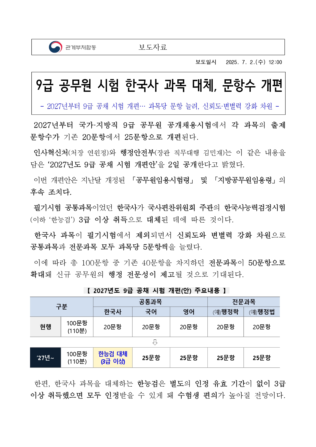 250702 (관계부처 합동) 9급 공무원 시험 한국사 과목 대체, 문항수 개편.hwpx
