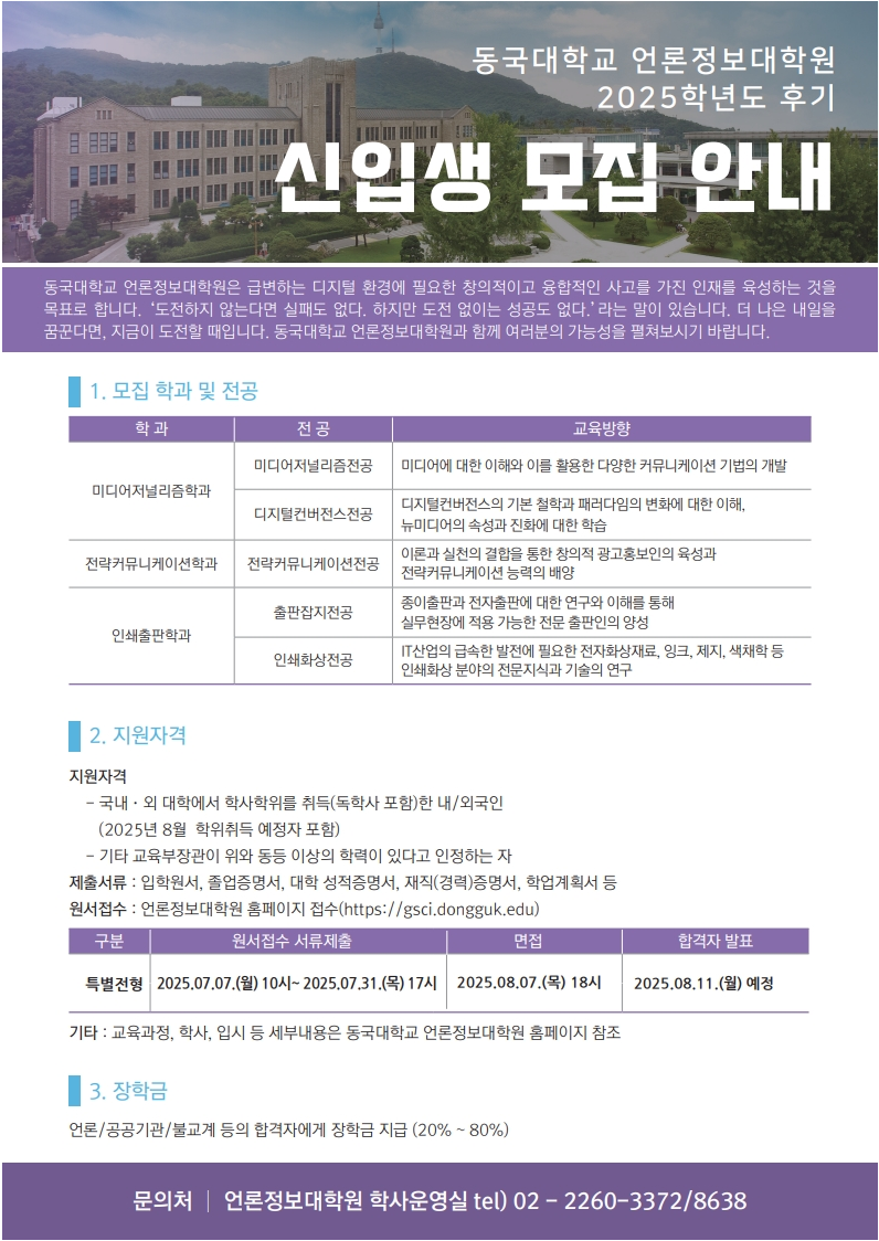 동국대학교 언론정보대학원이 2025학년도 후기 신입생을 모집한다.