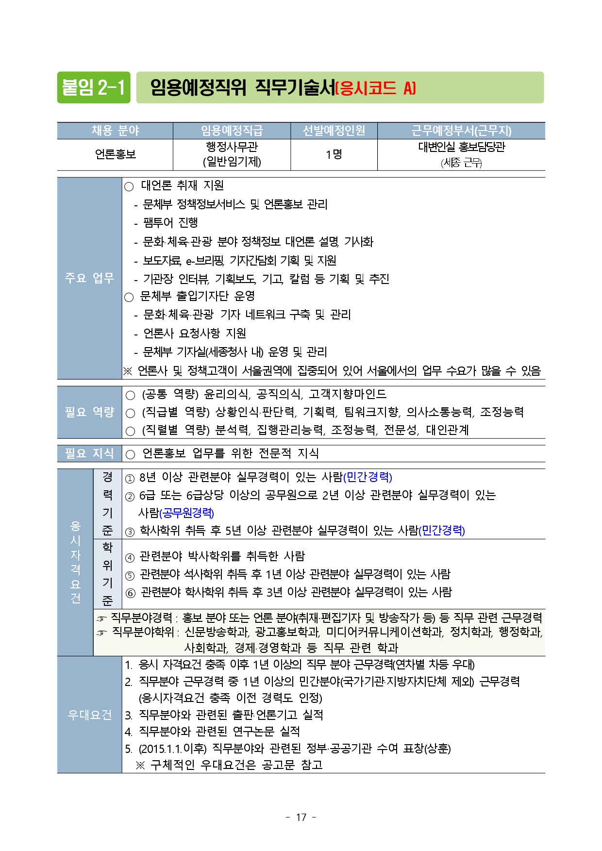 문화체육관광부에서는 공무원임용시험령 제3조 및 제47조에 따라 우수 인재의 공직유치를 위한 국가공무원 경력경쟁채용시험을 다음과 같이 공고하여 시행하오니 많은 응시 바랍니다.