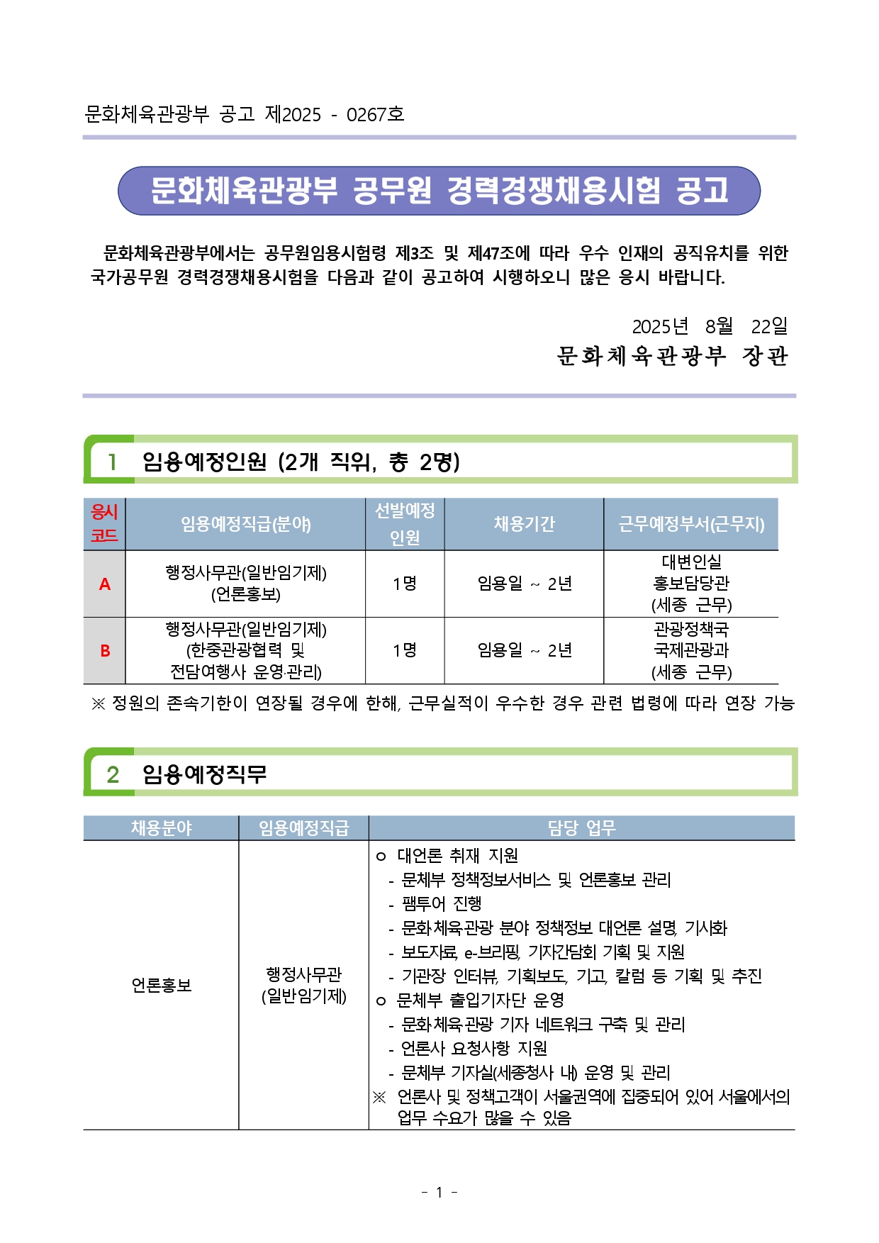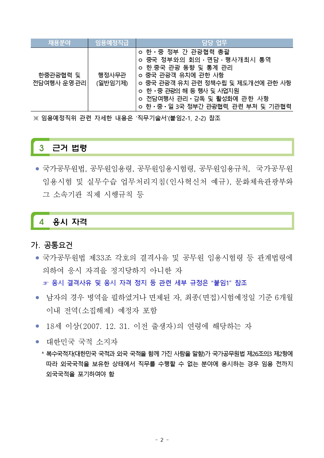 문화체육관광부에서는 공무원임용시험령 제3조 및 제47조에 따라 우수 인재의 공직유치를 위한 국가공무원 경력경쟁채용시험을 다음과 같이 공고하여 시행하오니 많은 응시 바랍니다.