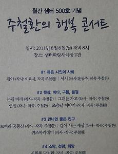 이틀 전 샘터 지령 500호 축하기념, 주철환 PD의 행복콘서트 현장에 다녀왔다. 장소는 샘터 사옥 지하에 있는 파랑새 극장. 2008년도 가을, 샘터 대학생 명예기자로 활동하면서부터 지금까지 샘터와의 소중한 인연을 이어왔다. 2년만에 뵙는 기자님들과 2기 대학생 명예기자 친구들을 보니 무척 반가웠다. 충만이, 지윤이, 다혜, 이미현 기자님, 박혜란 차장님, 표세현 기자님, 김성구 대표님까지. 이게 대체 얼마만일까. 첫번째 행복, 소중한 인연들과의 재회 샘터사옥에 들어가니, 3기, 4기 대학생 명예기자 분들이 열심히 콘서트 준비를 도와주고 있었다. 생기발랄한 그 분들을 보고 있으니 옛 취재의 추억이 새록새록 떠올랐다. 취재 울렁증을 이겨내고 첫 취재를 했던 분들의 얼굴이 하나 둘씩 스쳐 지나갔다. 더불어..