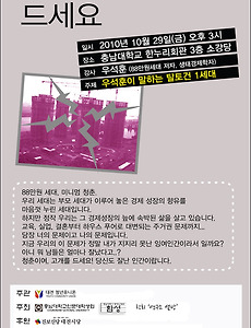 이야기 은행2548 강연리뷰를 꾸준히 블로그에 남겼더니 이런 결과가! 평소 유명인사들의 강연을 들으러 다니는 걸 좋아하는 터라, 블로그에 강연리뷰를 많이 남겼습니다. 그랬더니 어제 다음뷰에 이라는 이슈로 선정되어 제 강연리뷰가 소개되어 있더군요. 강연을 듣고 열심히 기록한 것에 보람을 느끼던 순간이었지요. 전부 제가 썼던 강연리뷰가 올라와 있더라구요. 때로는 강연리뷰를 남기며 혹시나 연사들의 뜻과는 다르게 기록할까봐 걱정하기도 했습니다. 그래도 강연을 듣고 난 제 개인적인 느낌을 더 많이 기록하는 게 좋을 것 같아 강연전체를 그저 요약만 하지는 않았습니다. 제 생각을 덧붙이고 직접 깨달은 점을 소중히 기록해 나갔지요. 유명인사들을 직접 본다는 설레임을, 그 날 강연에 참석하지 못한 다른 분들에게 그대로 전달해 드리고 싶었습니다. 처음 강연리뷰를 썼을 때는 간략한 느낌만 정.. 2010. 10. 15. 시를 사랑하는 분을 위한 문인수 시인의 강연 - 10월 26일, 대전한밭도서관 미당문학상(2007), 노작문학상(2003)을 수상한 문인수 시인의 강연이 오는 10월 26일 오전 10시 30분에 대전 한밭도서관에서 열린다고 한다. '나의 시 이렇게 쓴다'라는 주제로 살아있는 시창작의 이야기를 들을 수 있을 것으로 기대되다. 더불어 대전지역 작가 함순례 시인도 함께 참여하신다고 하니 더욱 풍성한 강연이 될 것 같다. 개인적으로 이창동 감독의 영화'시'를 본 이후에, 갑자기 시를 쓰고 싶을 때가 있었는데 마침 잘 되었다. 그 오묘하고 깊은 세계에 한쪽 발이라도 담궈볼 수 있을 테니 말이다. 10월 13일부터 선착순 전화나 방문 접수한다고 하며, 행복하게도 무료입장이다. http://hanbat.metro.daejeon.kr/ 대전 한밭 도서관 http://blog.naver.com/i.. 2010. 10. 14. 대학생들에게 추천하는 신개념 지식콘서트 신개념 지식콘서트가 11.9~10까지 잠실실내체육관에서 열린다고 합니다. 각 분야의 젊은 지식인들이 한바탕모여 흥미로운 지식을 전수해준다고 하니 꼭 가볼만 할 것 같습니다. 참가비는 일반인 15만원, 학생들은 6만원이라고 합니다. 저또한 가볼 생각입니다. 가을에 풍성한 강연이 열려서 너무 좋네요. 개인적으로 과학콘서트 정재승씨, 한국의 글꼴 장인 석금호씨, 가상현실 이미지 공학자 올리버 그라우씨의 강연이 기대되네요. http://www.techplusforum.com/ 이곳에 접속하시면 참가등록을 하실 수 있습니다. 홈 > tech+ 2010 > 포럼내용 10:00-10:10 입장 및 개막행사 10:10-10:30 이브 도즈 유럽 최고 경제석학, 인시아드 10:35-10:55 페리 하 실리콘밸리와 한국을.. 2010. 10. 14. 네안데르탈인과 현생인류의 운명을 바꾼 뇌의 진화 - 박문호 박사님 강연 이 글은 10월 13일 수요일, 충남대학교에서 있었던 뇌의 진화에 관한 통섭포럼 강연 내용을 요악한 글입니다. 개인적으로 뇌과학에 대한 지식이 부족하여 강연을 이해하는데 어려움을 겪었네요. "여러분, 상징(사물을 전달하는 매개적 작용을 하는 모든 것)을 쓰지 않고 다른 사람에게 어떤 내용을 전달할 수 있습니까?" 한국전자통신연구원 박문호 박사님이 학생들에게 던진 질문이다. 왠지 그 내용을 쉽게 전달할 수 있을 것 같은데, 손짓, 몸짓, 발짓, 눈, 소리, 말 모두 상징의 하나라고 생각하니 딱히 방법을 찾기 어려웠다. "그건 불가능합니다. 상징을 쓰지 않고서는 불가능한 일이지요." 그러면서 현재의 인류가 문명을 이루고 번창한 것은 바로 상징의 문턱을 넘었기 때문이라고 말씀하셨다. 네아데르탈인들의 경우 현재.. 2010. 10. 14. 88만원세대 저자 우석훈 교수님 충남대 강연 10월 29일 88만원세대의 저자 우석훈 교수님이 충남대에 강연하러 오신다고 한다. 대전지역에 사시는 대학생분들께 좋은 소식이 아닐 수 없다. 전에 이 분의 저서를 의미심장하게 읽었던 터라 나또한 기대된다. 20대 청춘들에게 그가 던지는 메세지는 희망에 가득찬 것일까? 절망적인 현실일까? 교수님께서 현실적이면서도 건설적인 강연을 해주실 거라 믿는다. 2010. 10. 13. 아버지의 편지 1통이 보물 1호인 이유 보물 목조건축·석조건축·전적(典籍)·서적·고문서·회화·조각·공예품·고고자료(考古資料)·무구(武具) 등 유형문화재(有形文化財) 중에서 역사적·학술적·예술적·기술적 가치가 큰 것을 문화재위원회의 심의를 거쳐 정부가 지정한 문화재. 역사적인 유물은 희귀하고 역사가 오래되면 그 가치가 높다. 그렇다면 희귀하고 보기드문, 아버지의 편지 1통도 그 값어치가 높지 않을까? 만약 보물 1호를 내 마음대로 지정할 수 있다면 아버지로부터 받은 편지 1통을 보물 1호로 지정하고 싶다. 첫째, 아버지의 편지 1통이 지닌 역사적 가치 왜냐하면 26년을 살아오면서 아버지로부터 편지 받은 기억이 몇 번 없는 데다가, 지금 내가 갖고 있는 아버지의 편지는 단 1통이기 때문이다. 어머니의 편지는 수십통이 넘는데 말이다. 아마도 아버지.. 2010. 10. 13. 아이폰으로 읽을만한 무료 책 어플 3권 지하철안에서, 버스안에서 아이폰을 만지작거리면 심심하지 않다. 게다가 가을이 되면 까닭없이 책 한장을 천천히 넘기며 사색에 잠기고 싶다. 그럴 때 읽을만한 아이폰 책 어플 5개를 모아 보았다. 유료어플이 아니라서 무료 어플이라