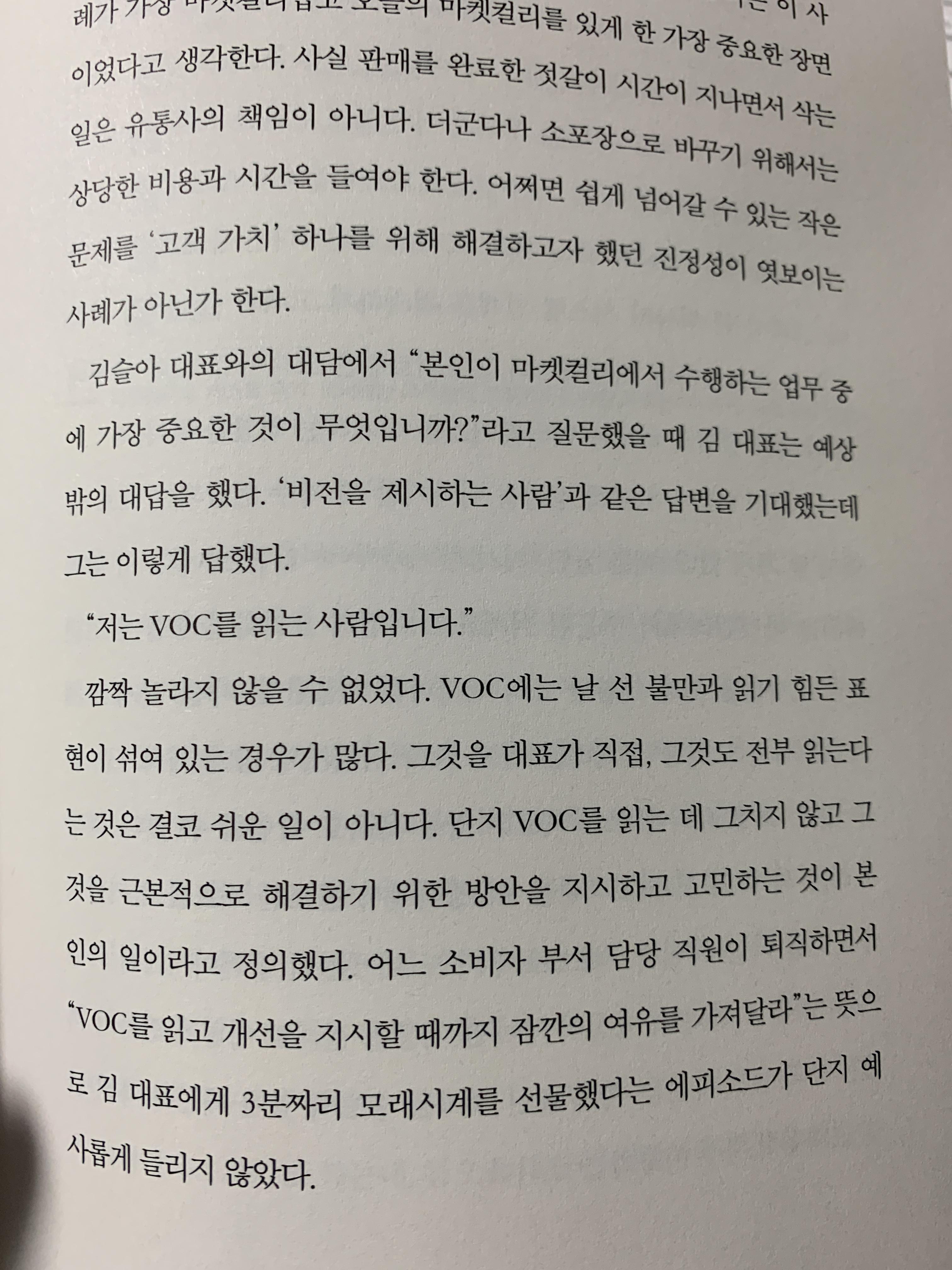 "여기에서 말한 위기 관리의 사례들은 단순한 미담이 아니다. 마켓컬리가 추구하는 고객지향적 관점, 즉 '장기적 탐욕'의 치열한 실천을 보여준다. (중략)간단히 말해 '당장은 단기적으로 손해가 나더라도 장기적인 관점에서 접근해가야 한다'는 마켓컬리의 철학을 의미한다. 이러한 장기적인 접근이야말로 고객 가치 실현은 물론이고 브랜드의 자산 가치를 높이는 가장 빠른 길일지도 모른다."