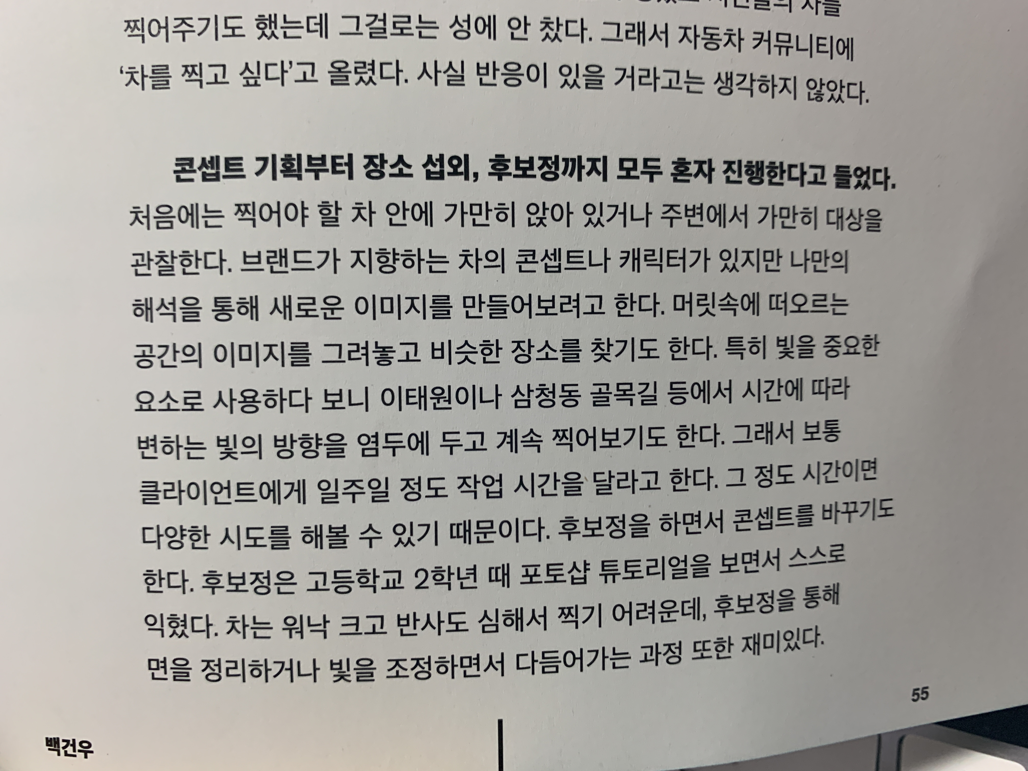 월간 디자인을 읽었다. 포토그래퍼 백건우를 만났다. 자동차 사진을 기가 막히게 잘 찍는 2001년생 포토그래퍼다. 그에 대한 인터뷰가 월간 디자인에 실렸다. 어린 나이에 벌써 자신의 전문 분야를 발견했다. 세상엔 능력자들이 참 많다. 그의 사진철학을 엿보자.