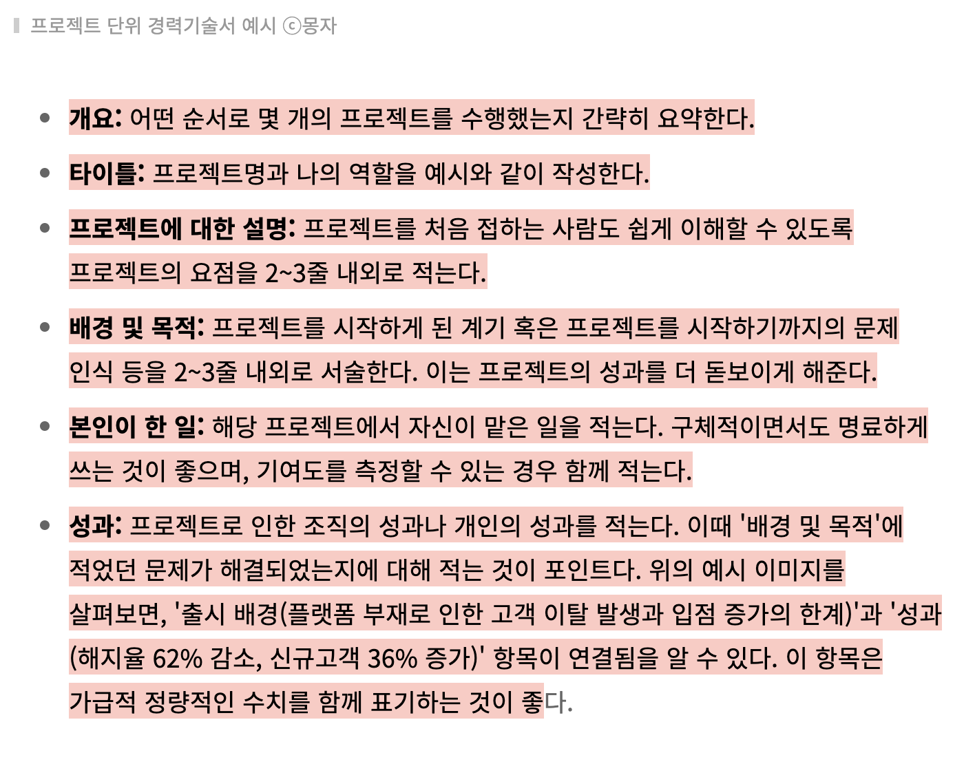 - 성과: 프로젝트로 인한 조직의 성과나 개인의 성과를 적는다. 이때 '배경 및 목적'에 적었던 문제가 해결되었는지에 대해 적는 것이 포인트다. 위의 예시 이미지를 살펴보면, '출시 배경(플랫폼 부재로 인한 고객 이탈 발생과 입점 증가의 한계)'과 '성과(해지율 62% 감소, 신규고객 36% 증가)' 항목이 연결됨을 알 수 있다. 이 항목은 가급적 정량적인 수치를 함께 표기하는 것이 좋다.