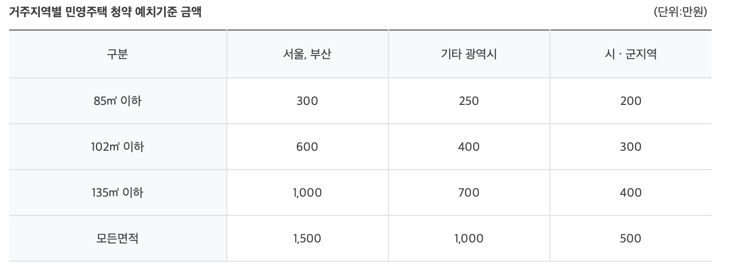 - 1순위 ① 수도권 (인천,경기 등) 건설 주택 : 가입 후 1년 경과 + 예치기준금액 충족