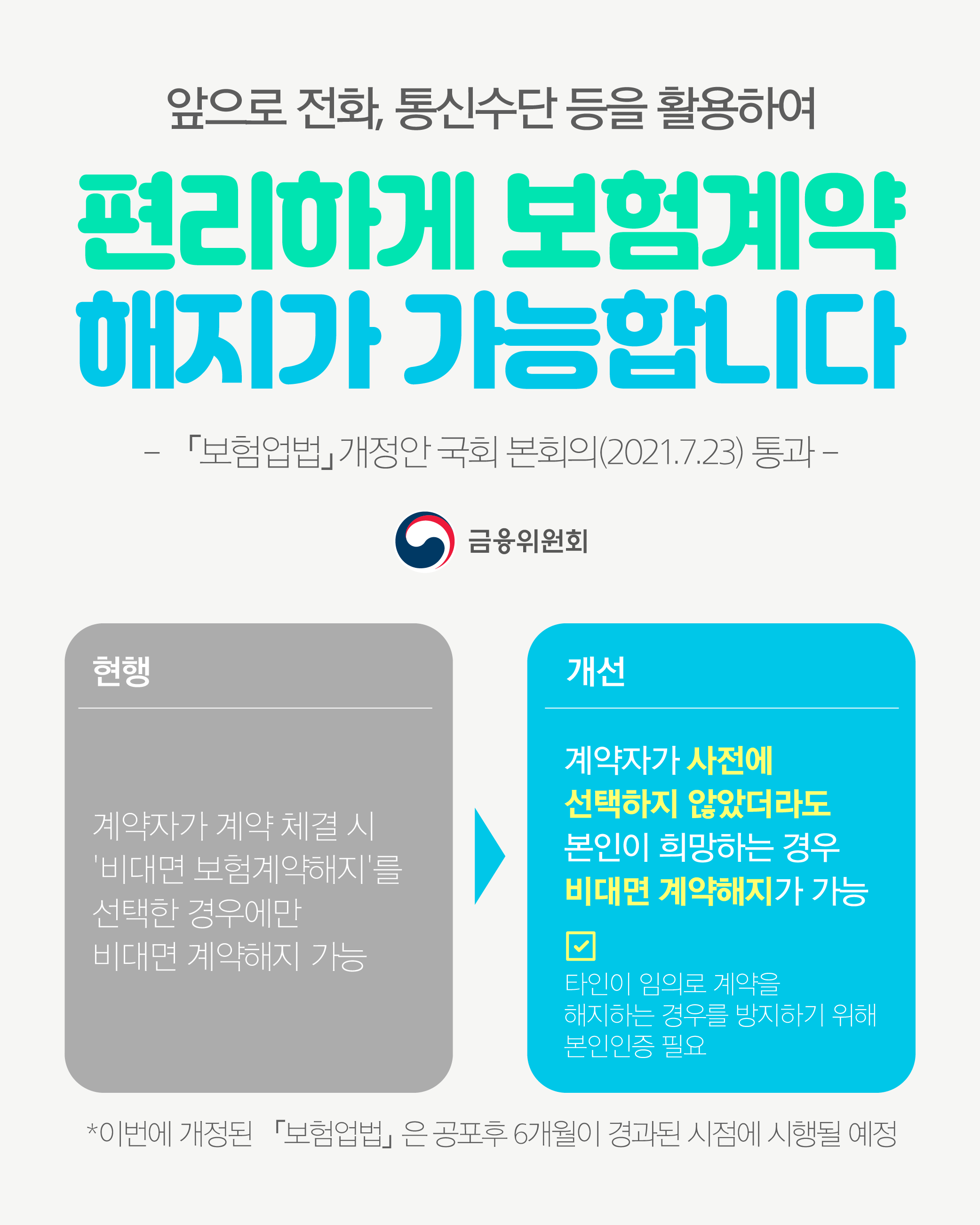□ 2021년 7월 23일, 비대면 방식(전화·통신수단)의 보험계약 해지를 허용하는 「보험업법」 개정안이 국회 본회의를 통과하였습니다.