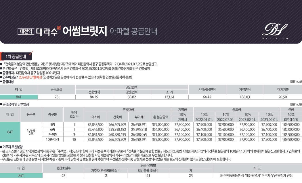 대전역 대라수 어썸브릿지 아파텔 공고문 1차, 2차 공급 I 8월 2일 청약신청