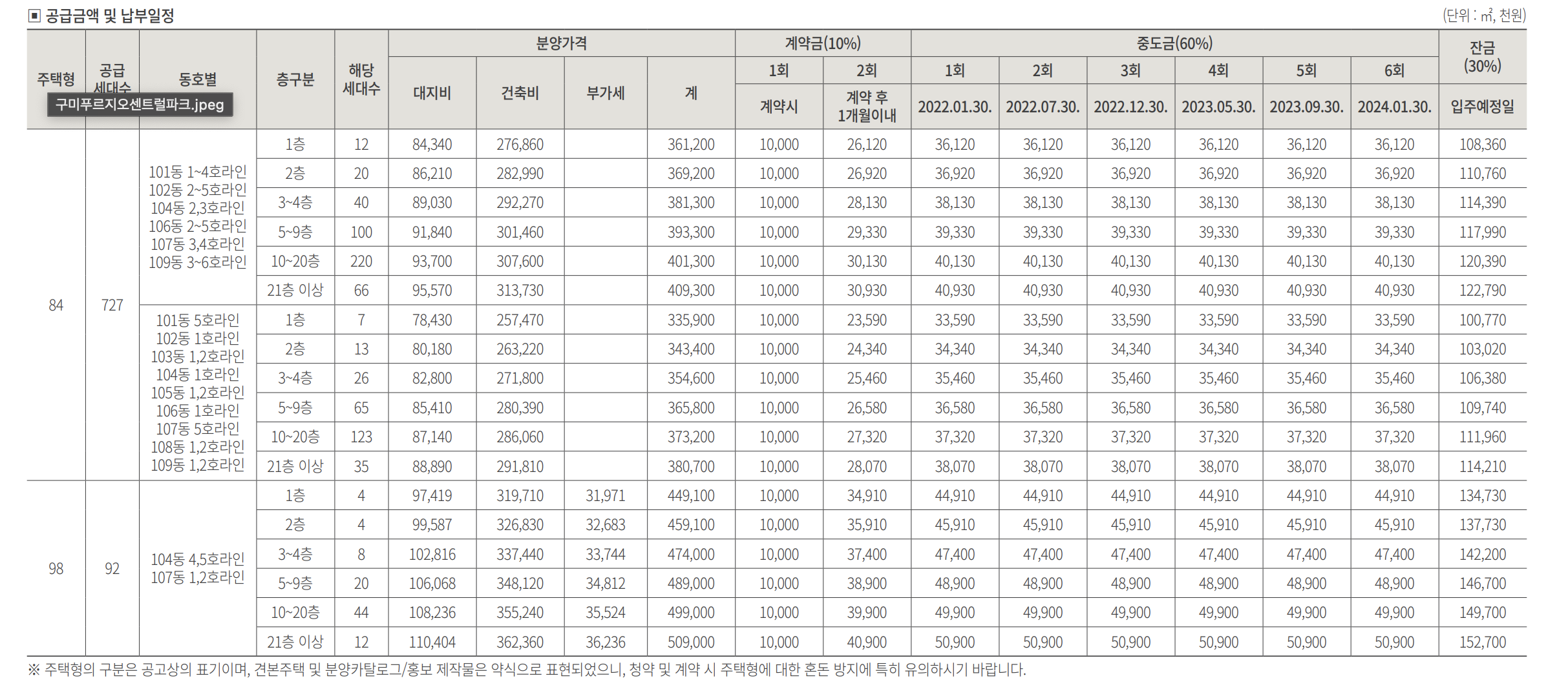 구미 푸르지오 센트럴파크 공고문 요약본입니다.