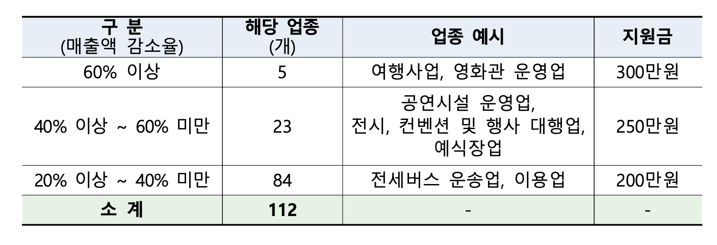 □ 국세청 부가세 신고 매출액이 ‘19년 대비 ‘20년에 20% 이상 감소한 “10개 분야 112개 업종(한국표준산업분류의 세세분류 기준)”이 대상입니다.