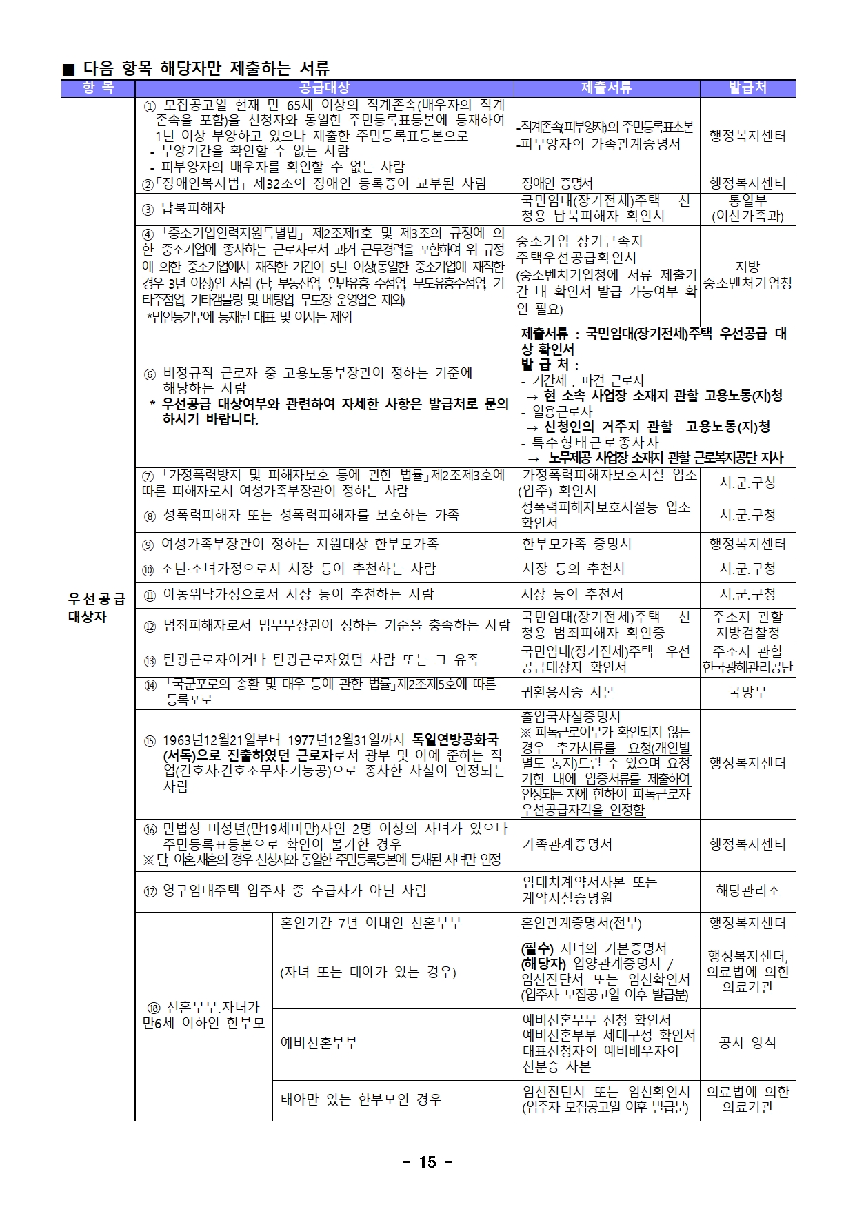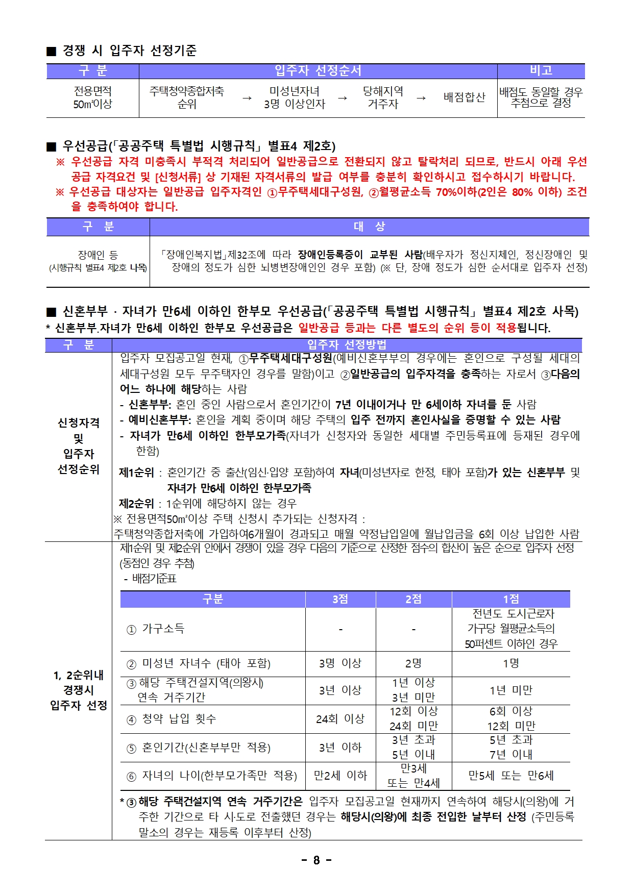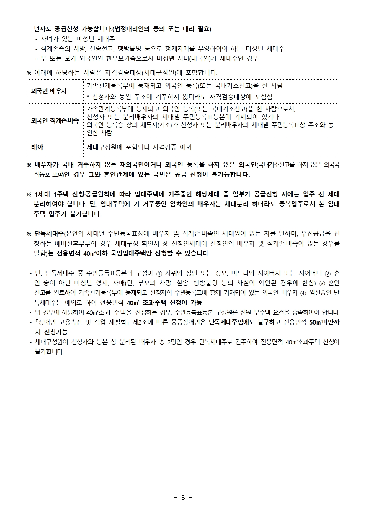 □ 공급대상자 : 공공주택 특별법에 따라 성년자인 무주택세대구성원으로서 유형별 소득, 자산, 자동차 보유기준 및 기타 관련법령에서 정한 요건을 충족하는 자