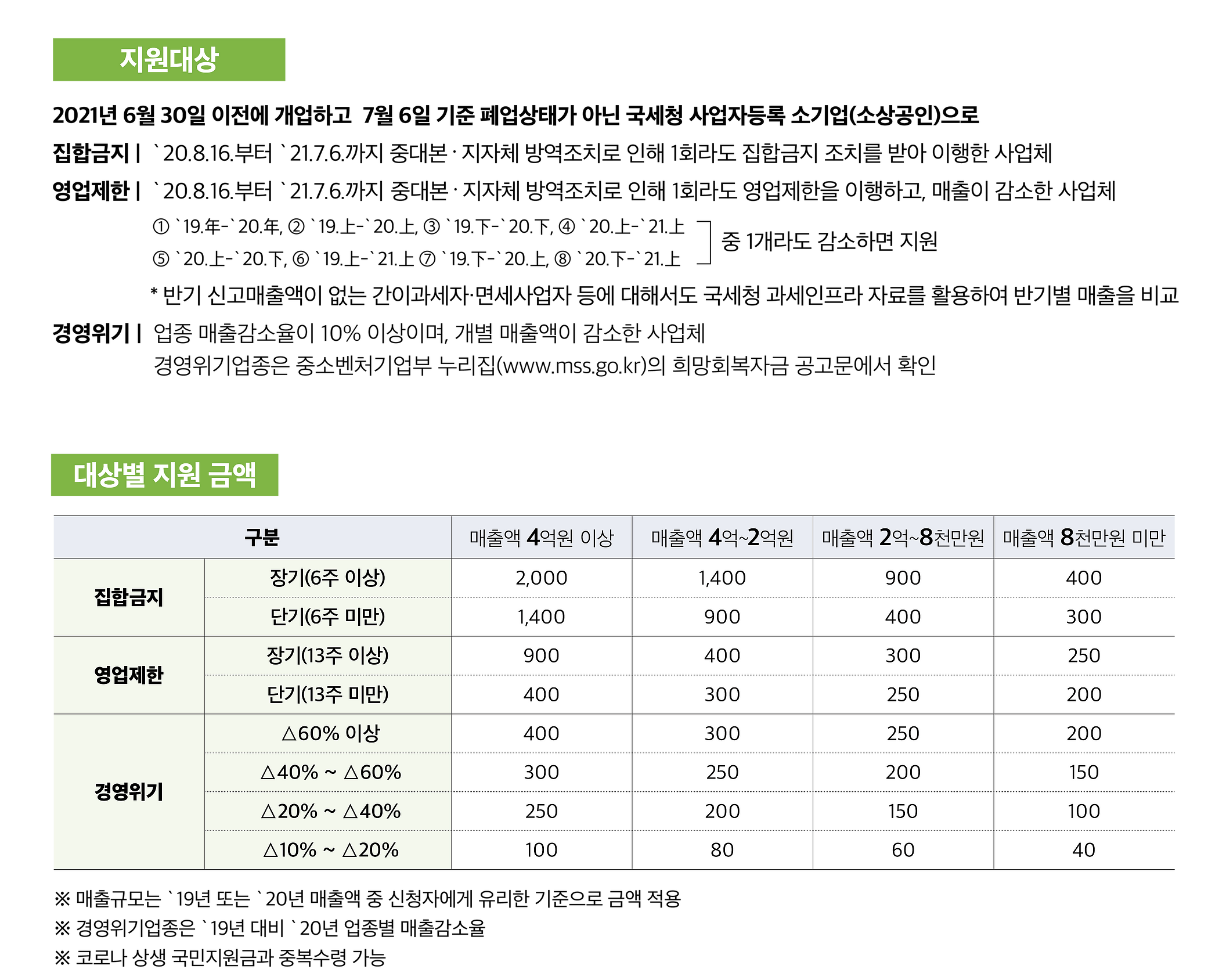 - ’20.8.16~’21.7.6 동안 1회라도 집합금지·영업제한 조치를 받거나 경영위기업종에 해당하는 소기업(소상공인 포함)