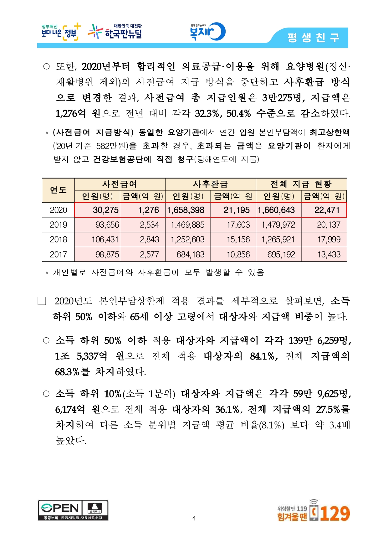 | * 본인부담상한제란? 과도한 의료비로 인한 경제적 부담을 덜어주기 위해 연간(1월 1일~12월 31일) 본인일부부담금(비급여, 선별급여 등 제외하고 환자 본인이 부담하는 의료비)의 총액이, 건강보험료 정산에 따라 정해진 개인별 상한금액(’20년기준 81~582만 원)을 초과하는 경우 그 초과금액을 건강보험공단이 부담하여 가입자·피부양자에게 돌려주는 제도 |