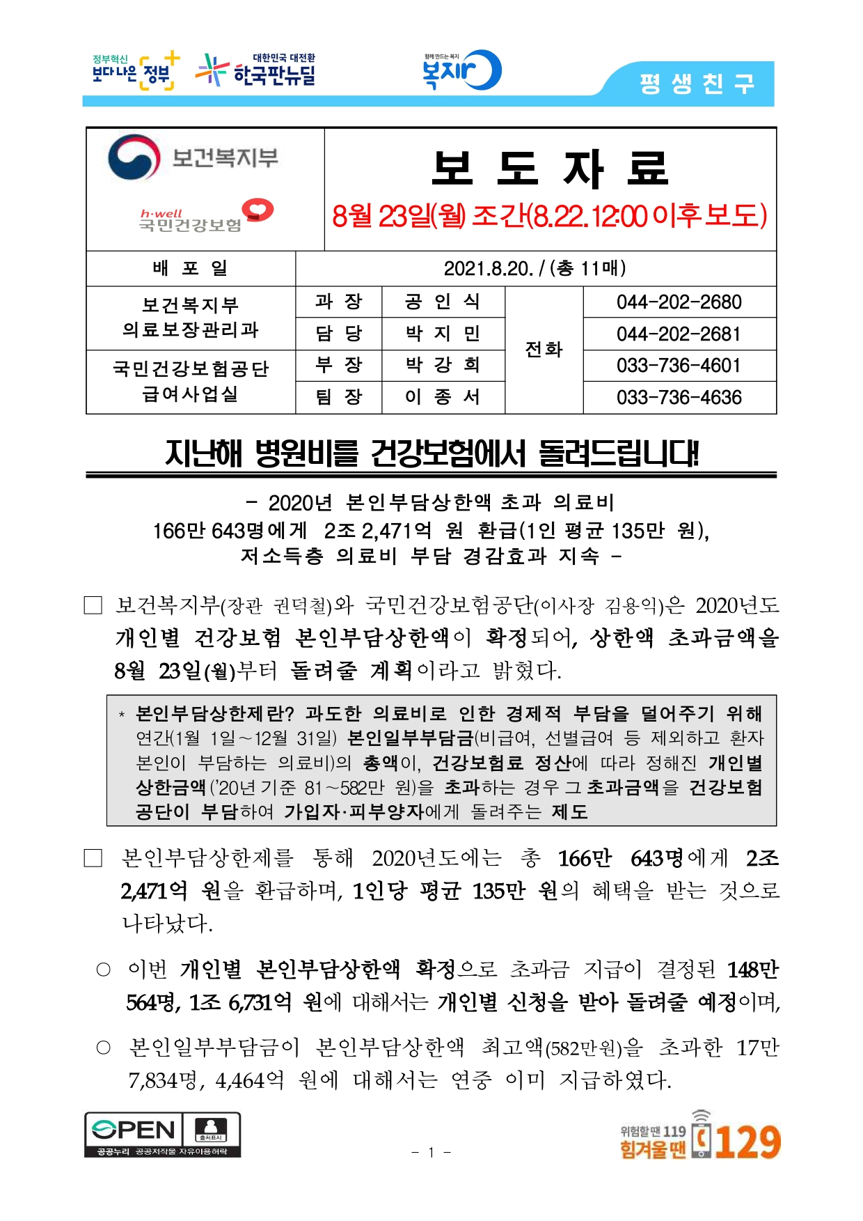 보건복지부(장관 권덕철)와 국민건강보험공단(이사장 김용익)은 2020년도 개인별 건강보험 본인부담상한액이 확정되어, 상한액 초과금액을 8월 23일(월)부터 돌려줄 계획이라고 밝혔다.